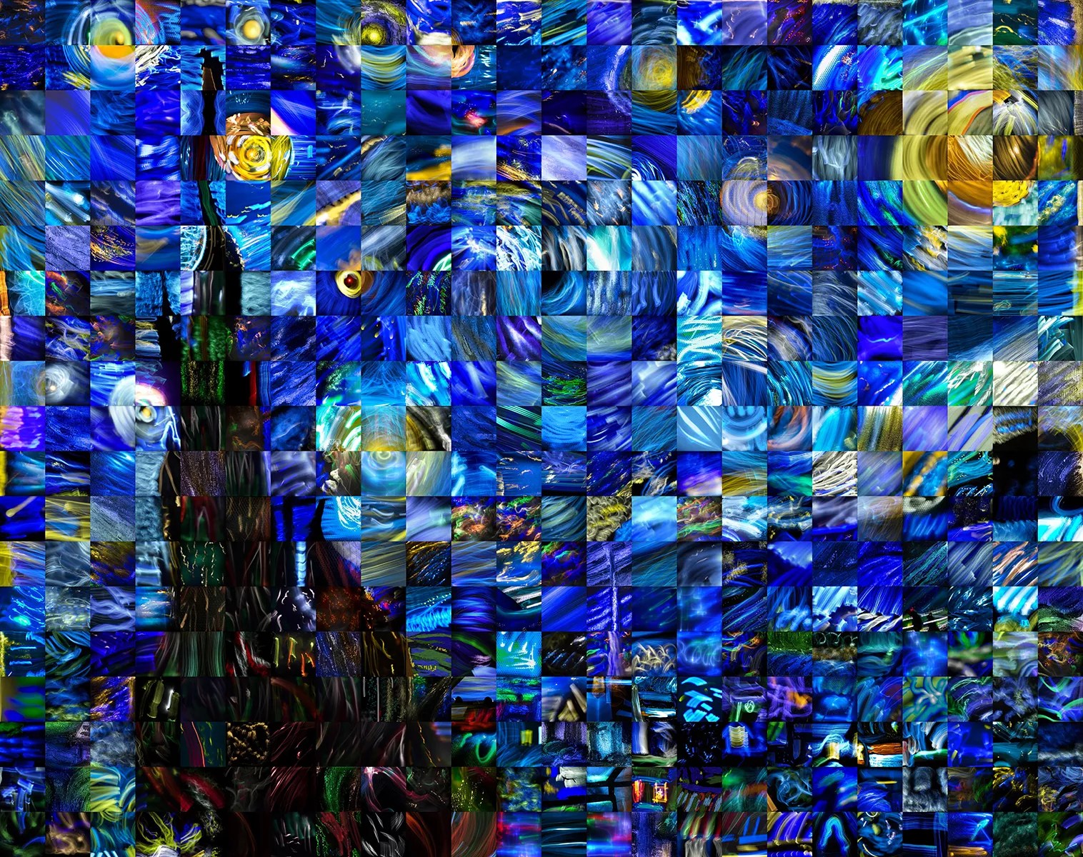 See Chick’s latest project: a group mosaic featuring fifty artists from twenty countries who made 456 light-painting photographs used as tiles that were put together to form a version of Vincent van Gogh’s “The Starry Night.”