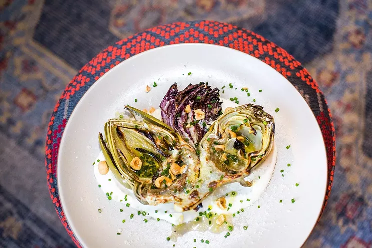 From my spot in the lounge that day, I could see people hustling off a newly arrived train, some trailing luggage, some kissing and holding hands. I could see other people passing time, staring at the orange Union Station sign, lost in their earbuds. I couldn’t see the busy-ness of the open kitchen, which you walk through to reach the chef’s table and two dining rooms — a larger one called the gallery, with windows on 16th Street, and the grotto, a narrow pass-through with parallel banquettes and stone walls. Those walls look pretty but don’t offer much in the way of soundproofing; one night, my husband and I gave up trying to talk over the loudly echoing voices of the foursome next to us swapping stories of trips to Sicily and France. But there was other entertainment: the two dozen or so front-of-house staffers who roam the dining rooms, leaving near-invisible trails in their constant laps of the space, like streaks of long-exposure headlights in a nighttime photograph.