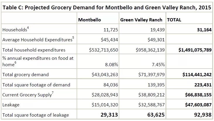 These conversations resulted in a document called the Montbello Market Scan Report – it’s accessible below – that presents a strong, data-based argument for why the time is now to put a supermarket in the neighborhood. Note the following graphic, which shows that so-called “leakage” – grocery-buying power in Montbello and Green Valley Ranch that’s not being utilized locally – topped $47 million in 2015.