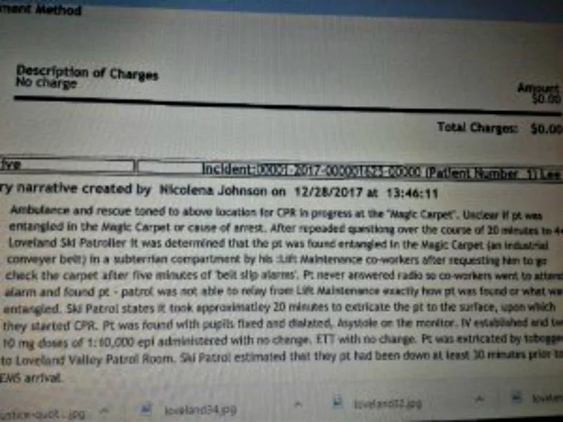 In another section of the site, Erika insists that Lee’s superiors “sent him down there” to work on the Magic Carpet – a claim that appears to echo a passage in a patient care report from Clear Creek County Emergency Medical Services, which can be accessed at the bottom of this post. The narrative states that “repeated questioning over the course of twenty minutes to four-plus Loveland Ski Patrollers” determined that Adam’s maintenance co-workers had found him entangled with the lift’s mechanics “after requesting him to go check the carpet after five minutes of ‘belt slip alarms.'”
