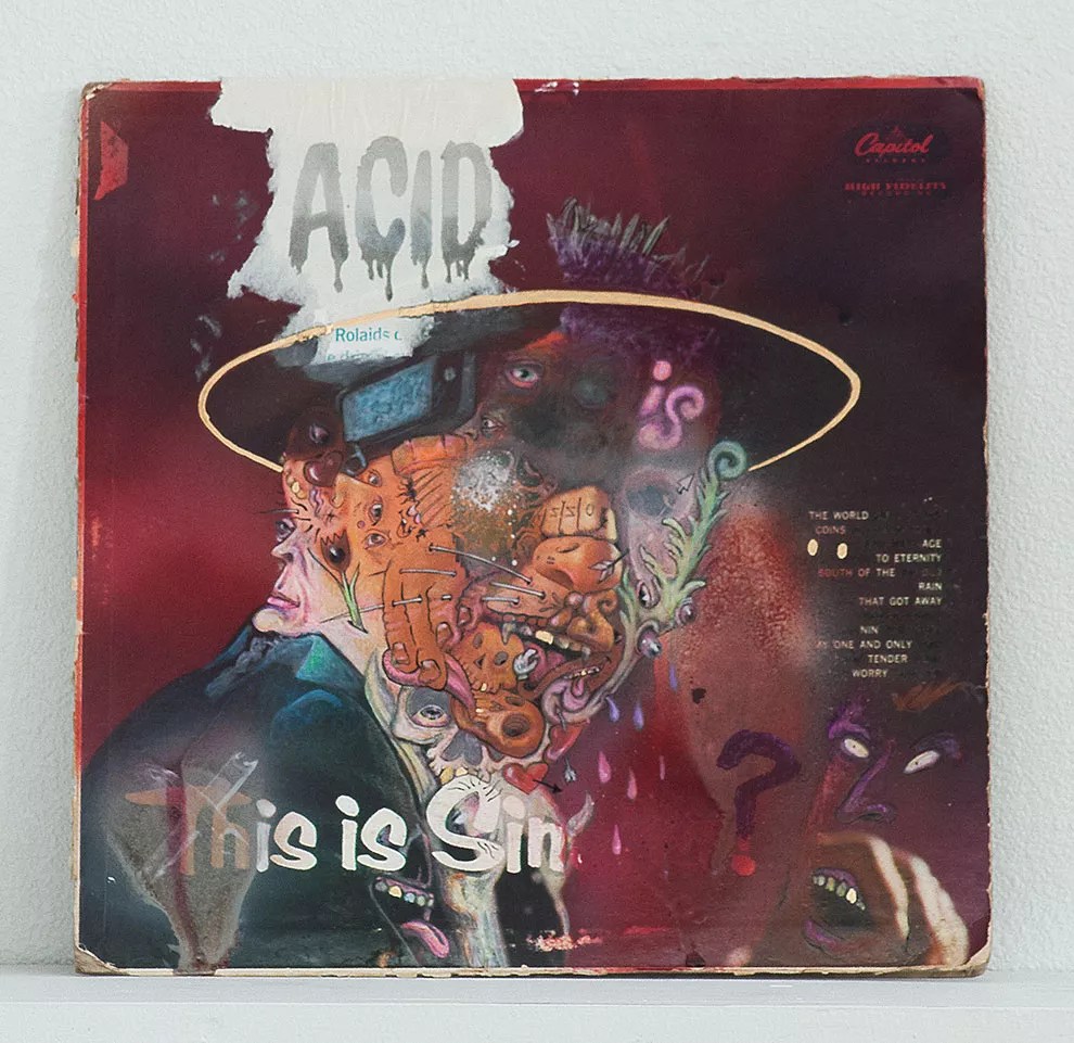 Donald Fodness, “This is,” mixed media on record album cover, 2016.