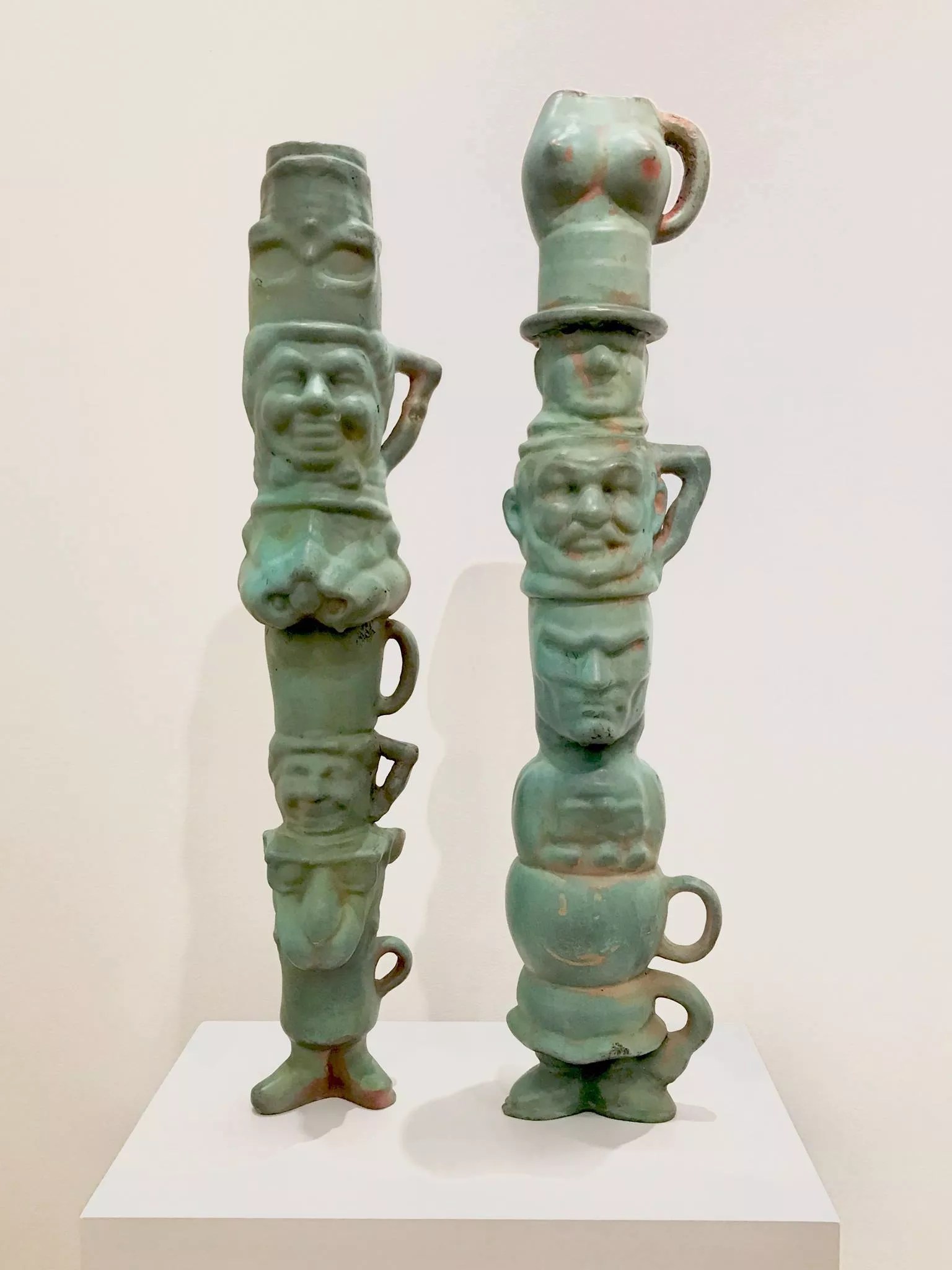 Case in point: Fodness, who’s been casting in bronze since working in a foundry after high school, returns to the medium for a work titled “Mr. and Mrs. Manyheads” that consists of two columns of stacked mugs.