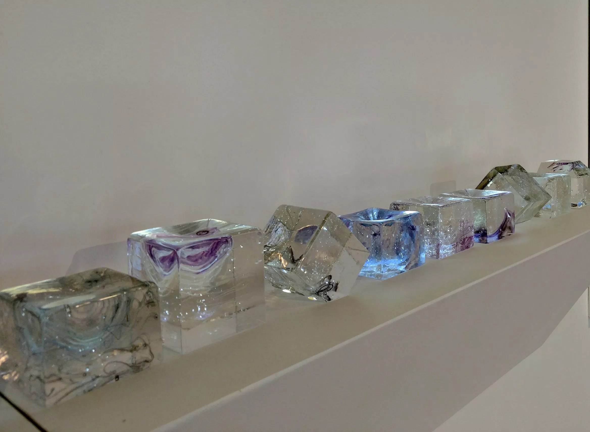 Seattle-based Etsuko Ichikawa is best known for her glass works, and the show includes several types. There are the cast-glass pieces based on neolithic Japanese ceramics, including the striking “Jomon Vitrified Figurine,” a miniature standing figure in uranium glass that has an internal glow, at least when lighted directly. The glass spheres from her “Orb” series look like paperweights, though they wouldn’t work as such (shaped like balls, they’d simply roll away). The “Orb” pieces have complex color relationships, with hidden color that’s only visible when the pieces are completely lit; conveniently, the gallery provides a flashlight you can use to direct light to the centers of the “Orb” sculptures. Another series, this one mostly comprising clear glass blocks, is “Vitrified Cubes.” Here Ichikawa’s use of strings and swirls of uranium glass allows these squiggles to glow electric green when illuminated.