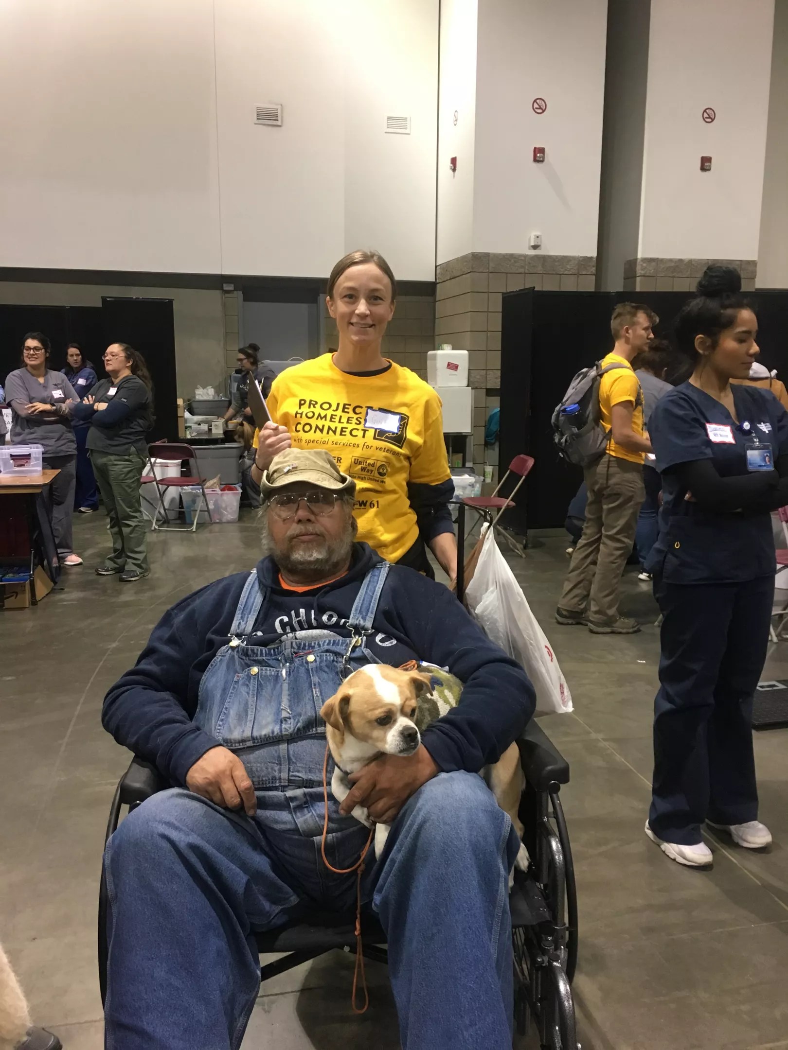 A volunteer helps Michael help his dog, Boudreaux, get grooming, vaccinations and a spay/neuter voucher.