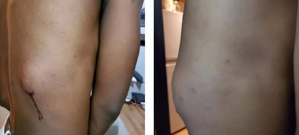 Two angles on a wound from a rubber bullet suffered by Alex Hickman.