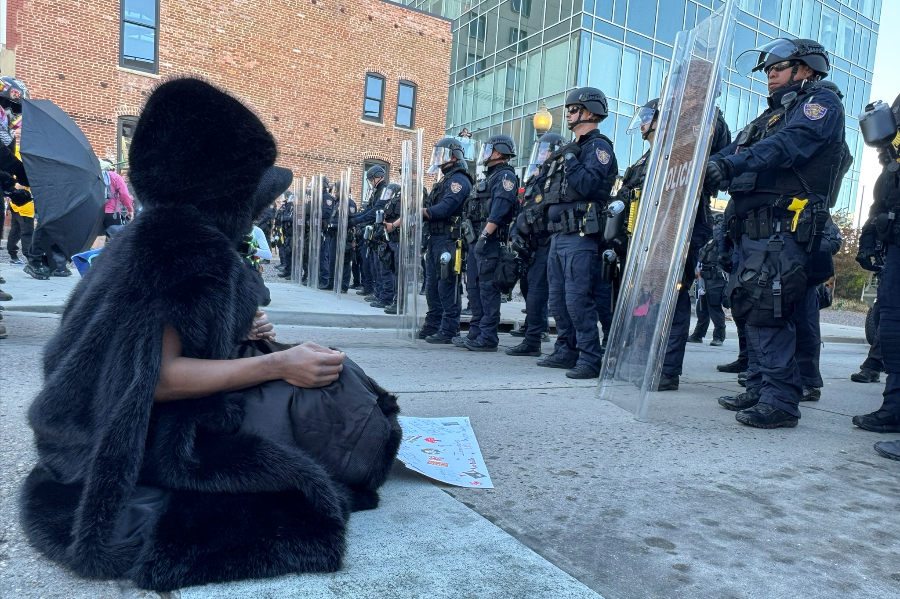 The crowd thinned as some protesters headed to 20th Street near Coors Field in an attempt to march onto the highway and disrupt traffic. They were stopped by heavily armed Denver Police Department officers and Colorado State Patrol troopers wielding tall riot shields and gas masks. Drones overhead also monitored these demonstrators, who stopped for a standoff at 20th and Chestnut Place.