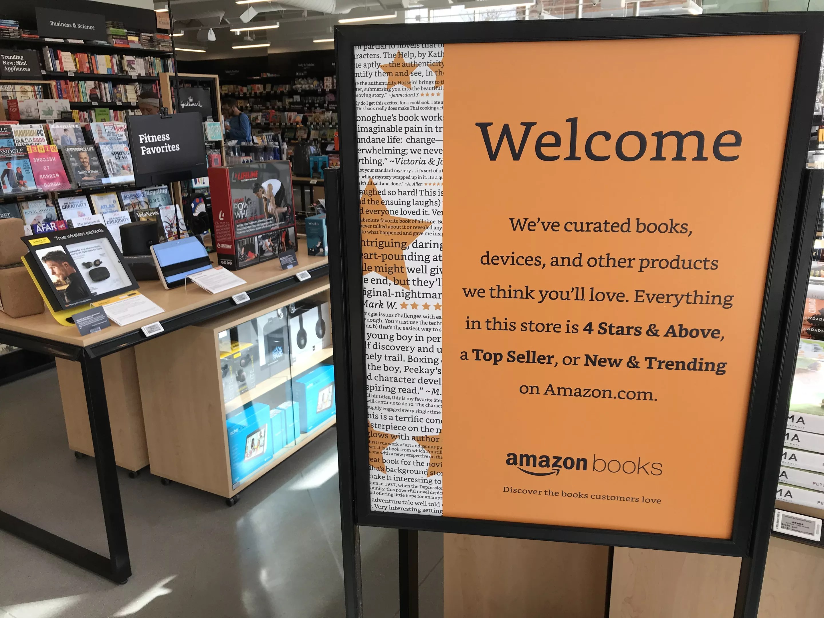Amazon Books is a customer-focused store, designed to spur discovery, a place where customers can find great books and learn more about our devices. Amazon Books is a physical extension of Amazon.com; we’ve applied over twenty years of online bookselling and retailing experience to build a store that integrates the benefits of offline and online shopping. We wanted to create a great customer experience where customers could come in, take their time browsing great books and feel confident in their selections, because everything in the store is highly rated. Because we are limited by physical space, we have curated our stores to only carry books, devices, toys and games that our customers love. All of the books, devices, toys, games and other products in our stores are selected by our team of curators.