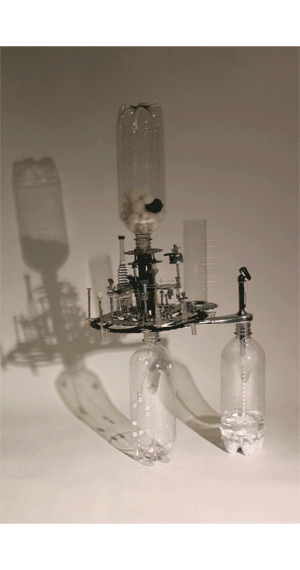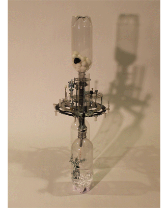 Penalba had made a contraption with a couple of glass bottles connected with bicycle gears and wires. The sculpture represented her brain, and she knew that it needed to come alive somehow — so she learned how to make videos on the computer, to transform it to life. “I’m not coming here just to make my amazing idea,” she notes. “I’m coming here to discover things.”