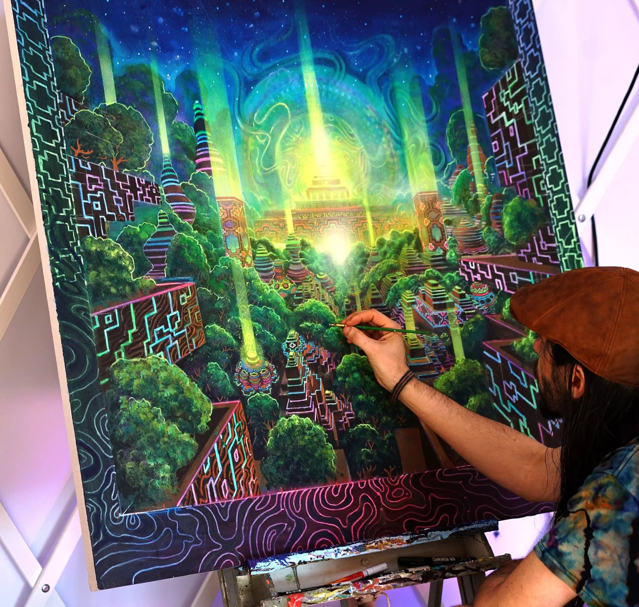 Threyda will fête Bay Area psychedelic visionary artist Jonathan Solter, a live painter and muralist whose specialty is inspired by higher dimensional travel, ancient civilizations and animism, with a one-night ticketed party offering a signed print and free food and drink for the $25 entrance fee. Solter is hanging solo works and others created in collaboration with Seth McMahon for the event.