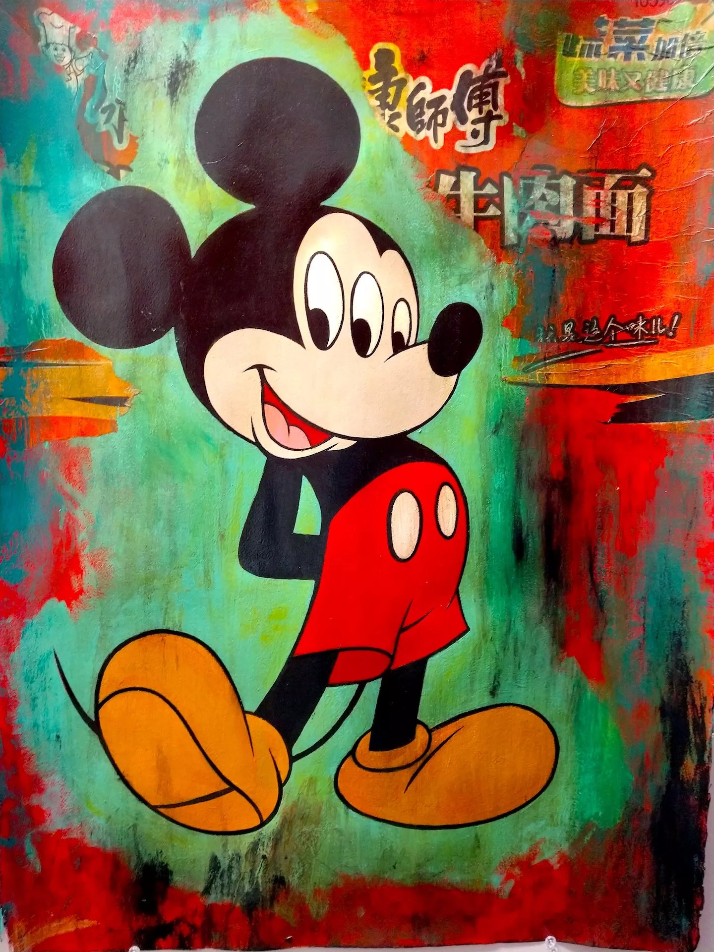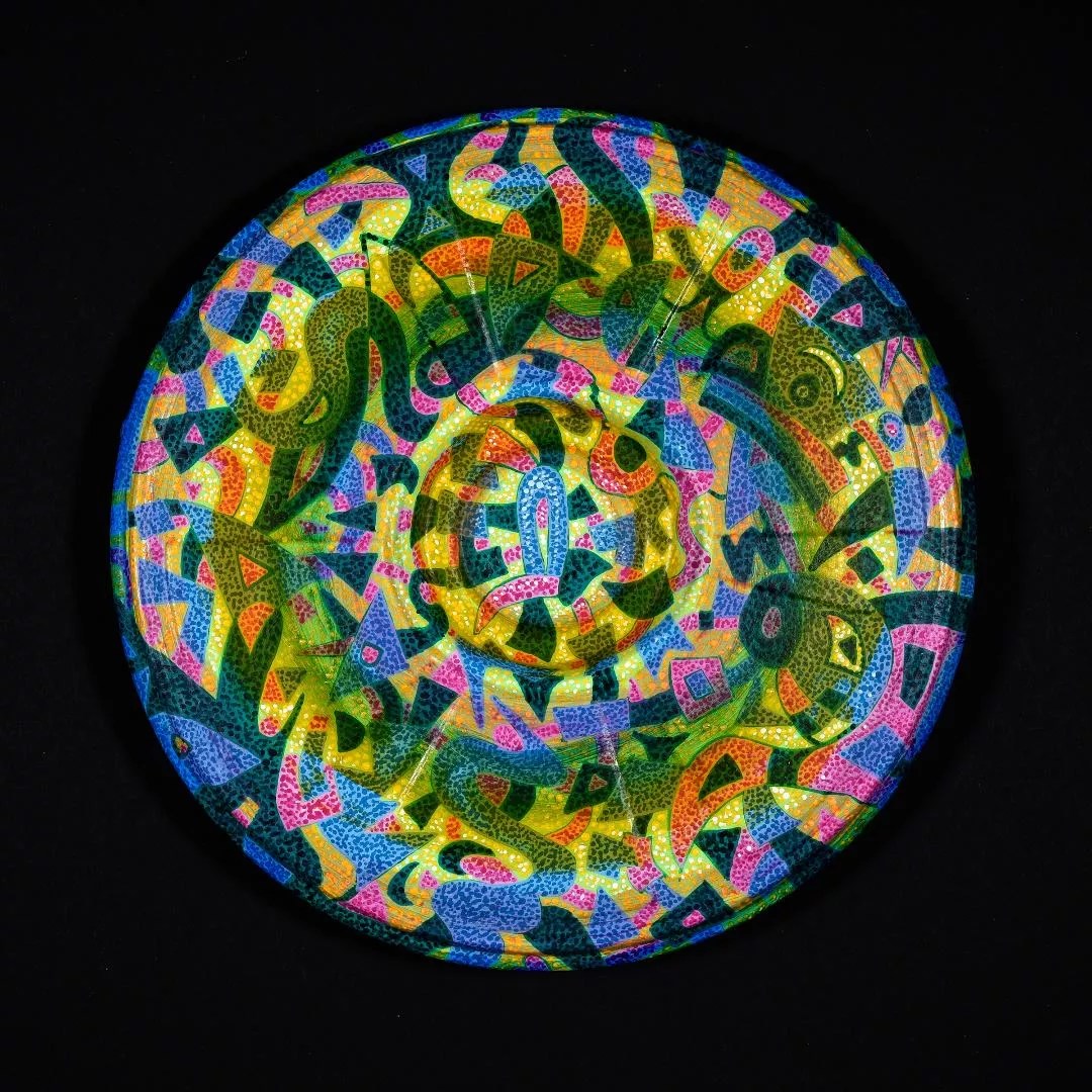 Bruce Thorn, “Flying Flat,” 2023, oil on vintage steel automobile hubcap.