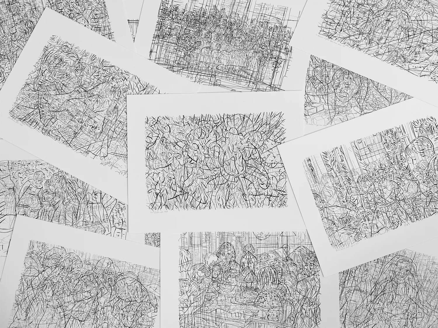 A pile of Britland Tracy’s traced drawings of mid-century photo-slides.