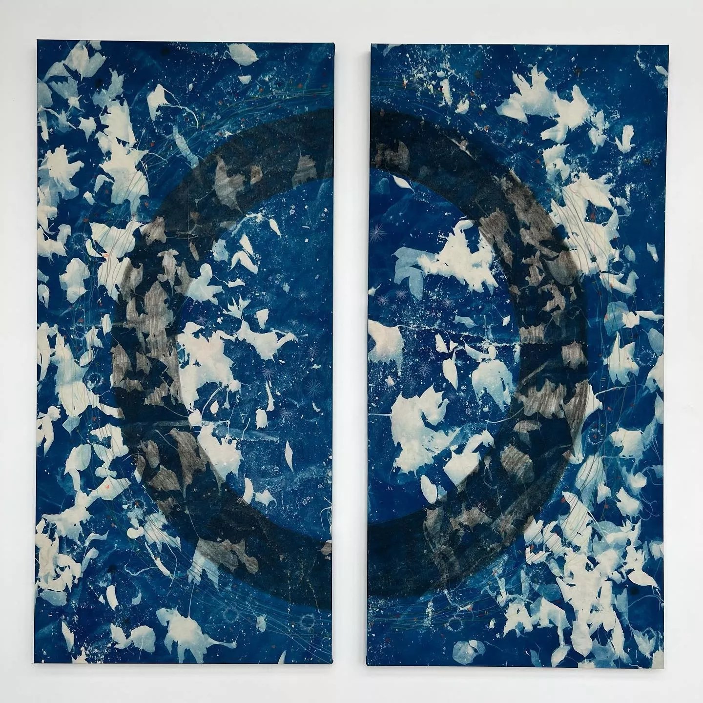 cyanotype, salt crystals, pastels, graphite, color pencil on stretched cotton.
