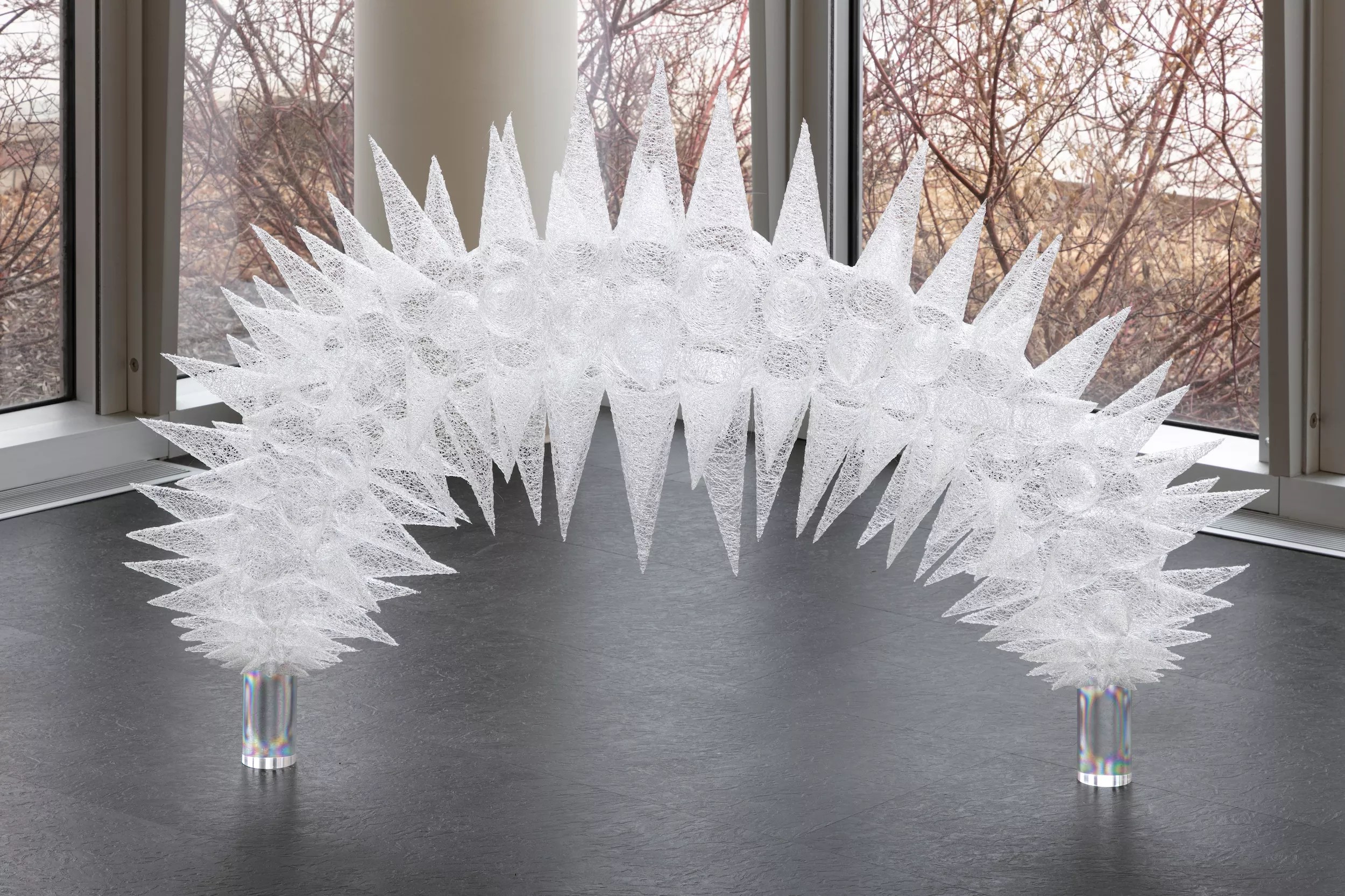 Jodi Stuart blends digital and handmade practices – and a lot of cheerful color – into her woven sculptures created using plastic filaments usually fed into 3-D digital printers. It’s a bit of a joke how she uses the digital tool to hand-weave a sculpture, and the title, Toxic Positivity, drives in the punchline: The synthetic materials she uses to replace thread or organic basket-weaving stems might make for a pretty picture, but there’s a specter of perfect, experience-bleeding technology hiding behind the curtain.