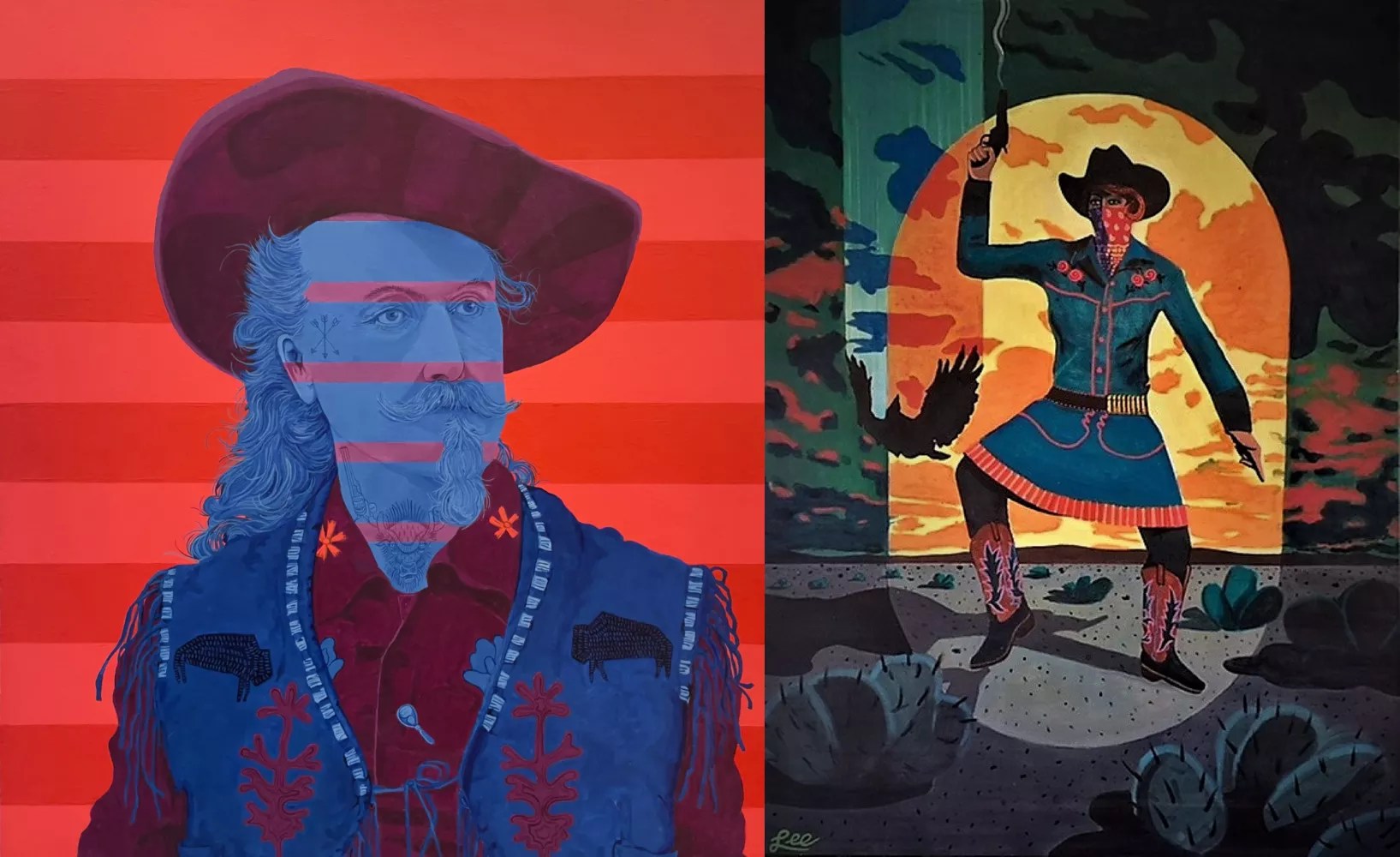 Earl Chuvarsky: “Buffalo Bill Cody, no. 5,” acrylic on canvas, and Ryan A Lee: “Buffaloe Barb,” mixed media.
