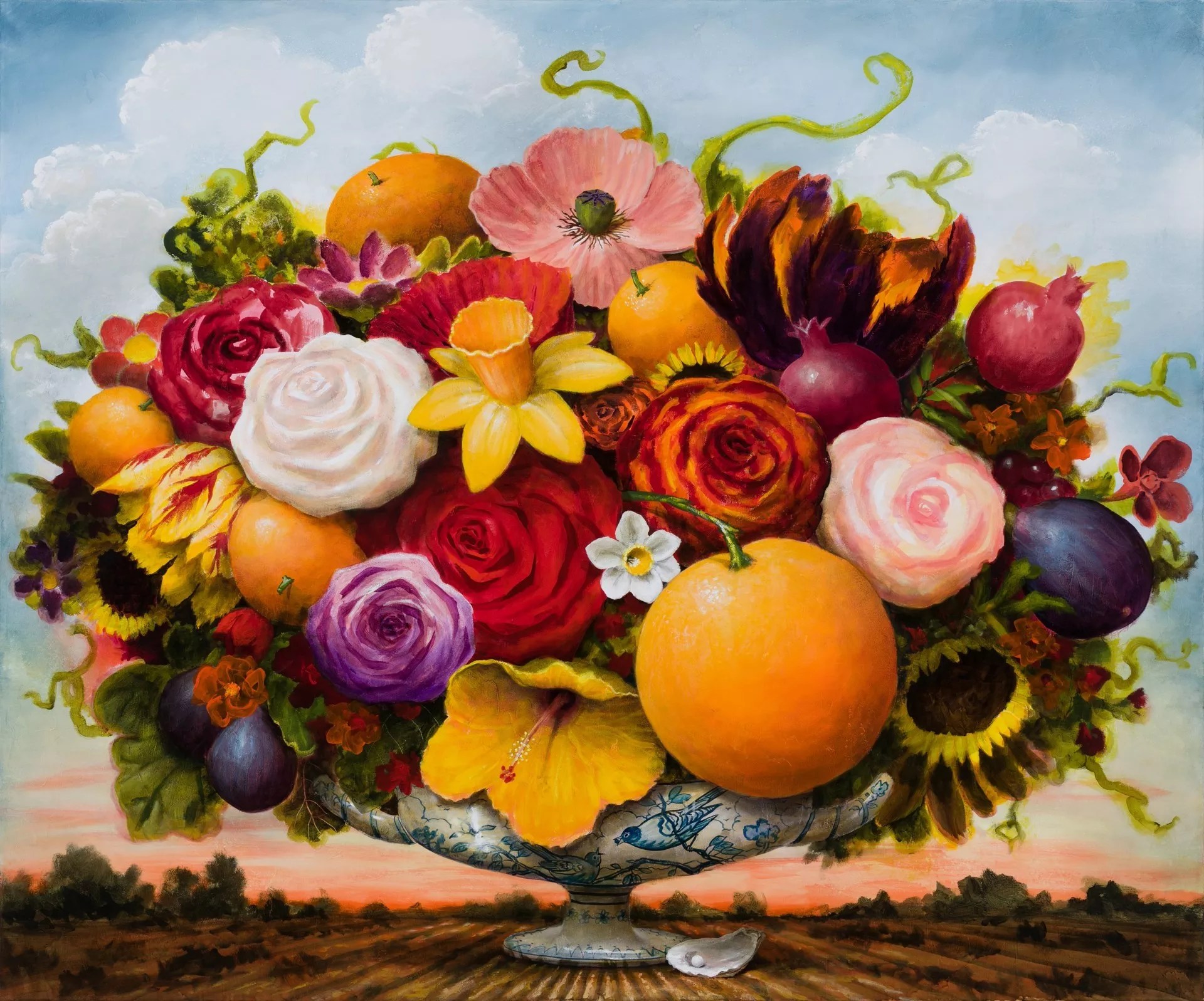 In the main gallery, K Contemporary showcases surrealist Kevin Sloan in Fervent Emblems, a collection of new work drenched in brightly colored floral bouquets – some potted, some displayed in dishes and others in frames – all set against lush landscapes. In contrast, Kuzana Ogg’s breezy, bleeding wash paintings float through the project space like a foggy morning, acting as welcoming portals.