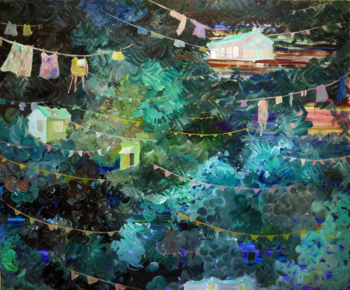 The subjects are often dark, even when the palette is pale, as in “The Flags,” an acrylic on canvas. It’s a landscape, with the foreground filled with trees carried out in a range of greens and the background filled with pink flowering trees and an orange sky. The flags of the title fly from poles running across the length of the composition. Owing to the luscious colors, “The Flags” is lyrical and light-filled, but there’s a disturbing undercurrent in the subject matter: People are hanging from some of the poles as though they were flags. A similarly disquieting scene is seen in the closely related “The Sunday Dusk,” a wooded scene in which strings crisscrossing the picture are hung with lights, banners, clothes and a couple of old people with canes.