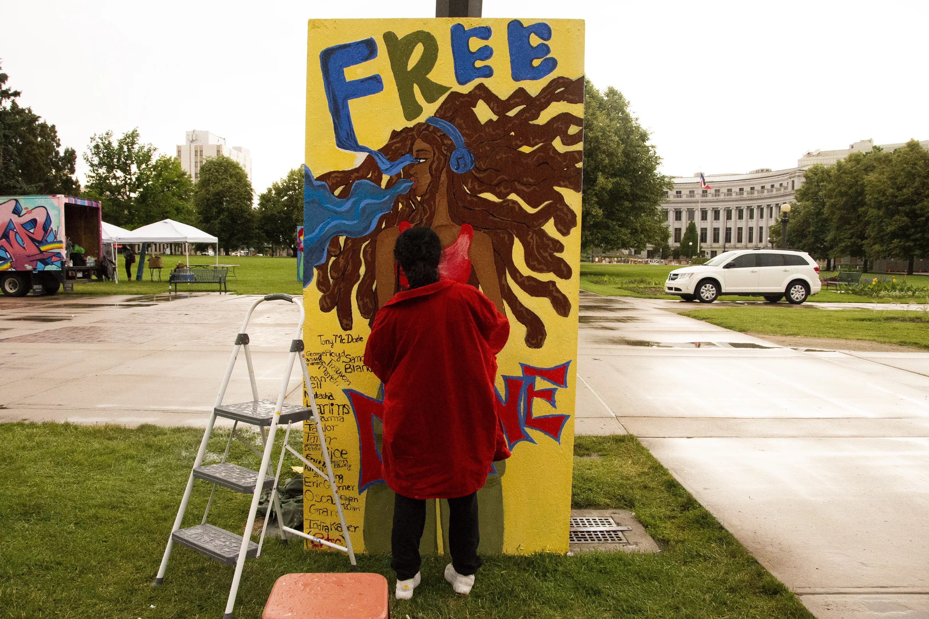Eighteen-year-old Hermela Hailu, one of the student organizers of the Black Lives Matter protest put on by DSST Byers at Cheesman Park on June 16, was given a painting space after Gray met her handing out fliers in Civic Center Park. Her mural is of a black woman with flowing hair painted on a yellow background. It says “Free Mine” in big letters at the top and bottom.
