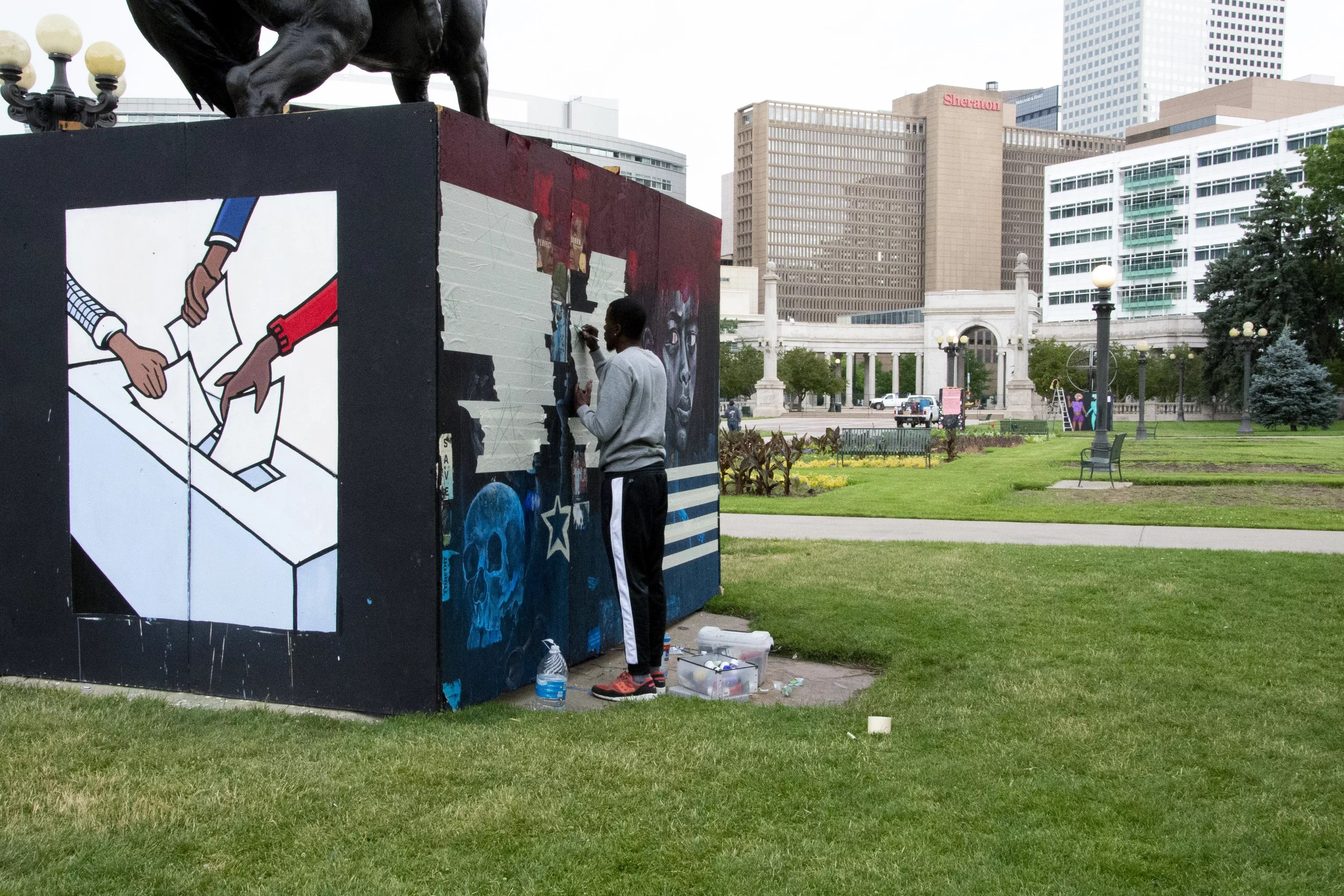 Gray is the creative director of Rob the Art Museum, a marketing collective that uses art to organize community events. He collaborated with Annie Phillips of IRL art, which also organizes multimedia art exhibitions around Denver. After coming out to Civic Center Park on Tuesday, June 2, to engage in cleanup efforts, Gray decided to reach out to local artists and organize the mural event.