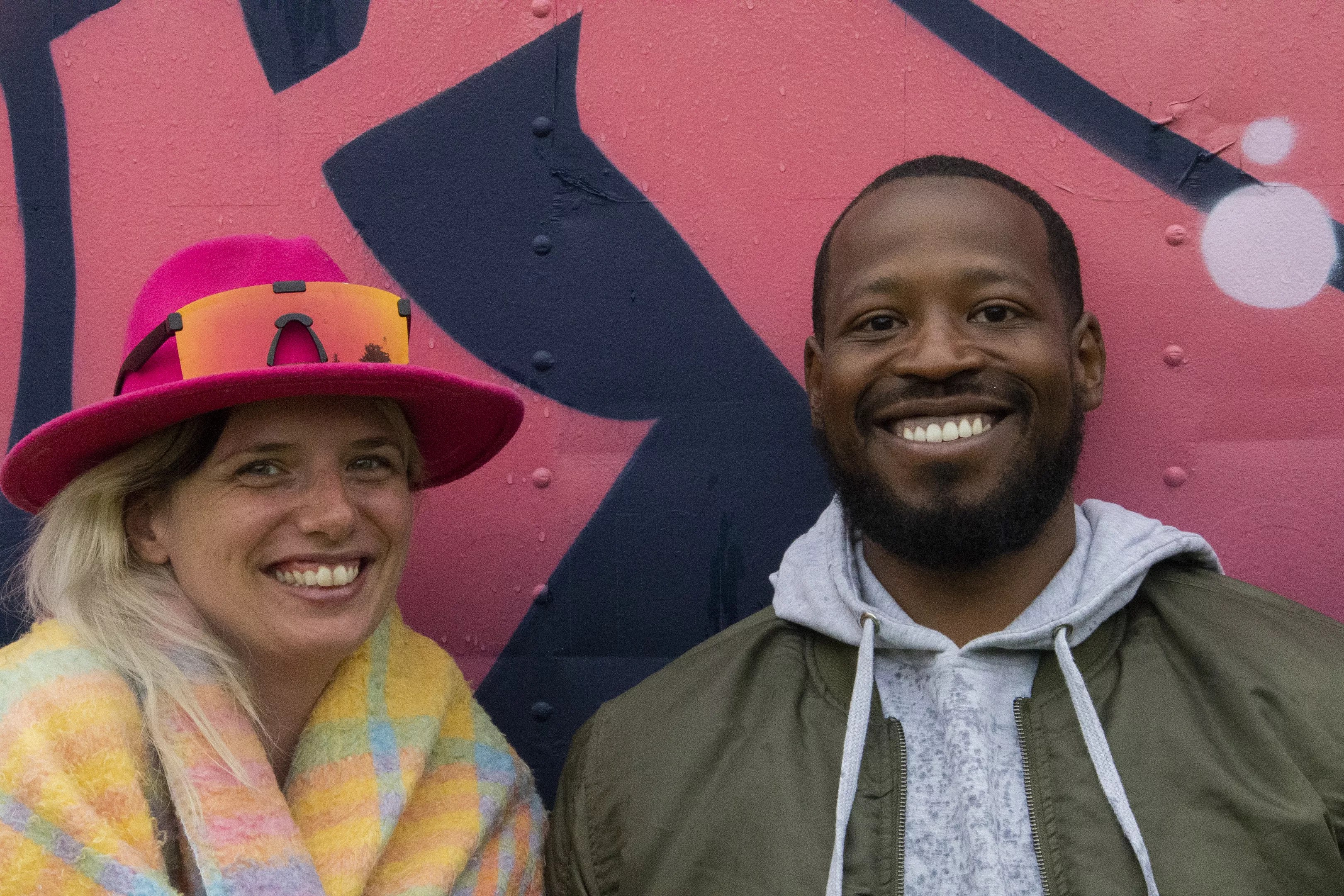 Annie Phillips and Robert Gray pose in front of a mural on June 19.