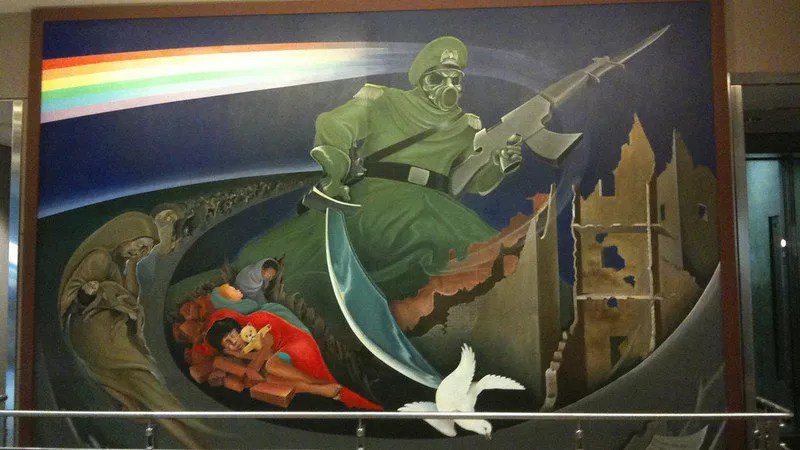Particularly the hundreds of thousands of people who’d pass by the murals as they hurried through the airport, until “Children of the World Dream of Peace” was temporarily removed for that delayed, over-budget terminal renovation project at DIA. (Talk about bedeviled!) The change.org petition requests that it not be returned to a public space, since it “prominently features death and violence.” And “In Peace With Harmony and Nature” can go, too, since it “features disturbing imagery that is not appropriate for mass consumption.”