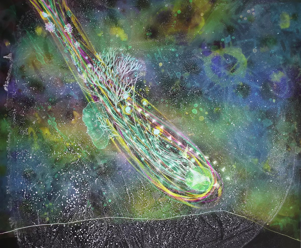 My work draws upon the imagery of nature, the sciences and the cosmos, but it is not limited to a conventional reading of these realms. It imagines that the depths of the ocean reach into outer space, that through an organic prism, vision can fluctuate between the micro- and macroscopic. My practice is devoted to experimenting in various mediums and my interest in the natural world and its curiosities while appreciating nature in difficult times.