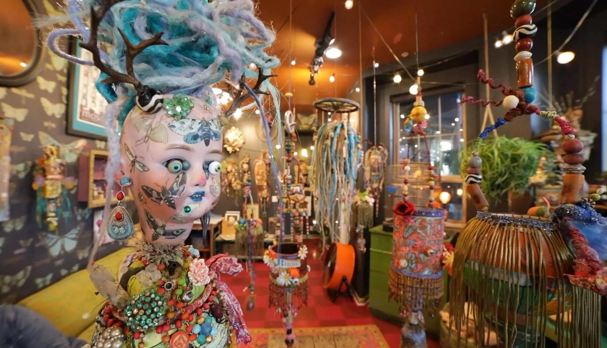 To know Paul Moschell is to love him. An artist with a designer’s eye, he is known for his assemblage sculptures made from doll parts and encrusted with beads, bits of costume jewelry, wool dreadlocks, ribbon, hat pins, fake eyeballs and a zillion other found objects. Visiting Moschell’s studio is like walking into a cabinet of curiosities, one that’s perhaps just this side of creepy – if it wasn’t so much fun. Moschell also creates matchbook art and will have soaps, travel lotion and a HallowKween fragrance packaged in a Paul Moschell design.