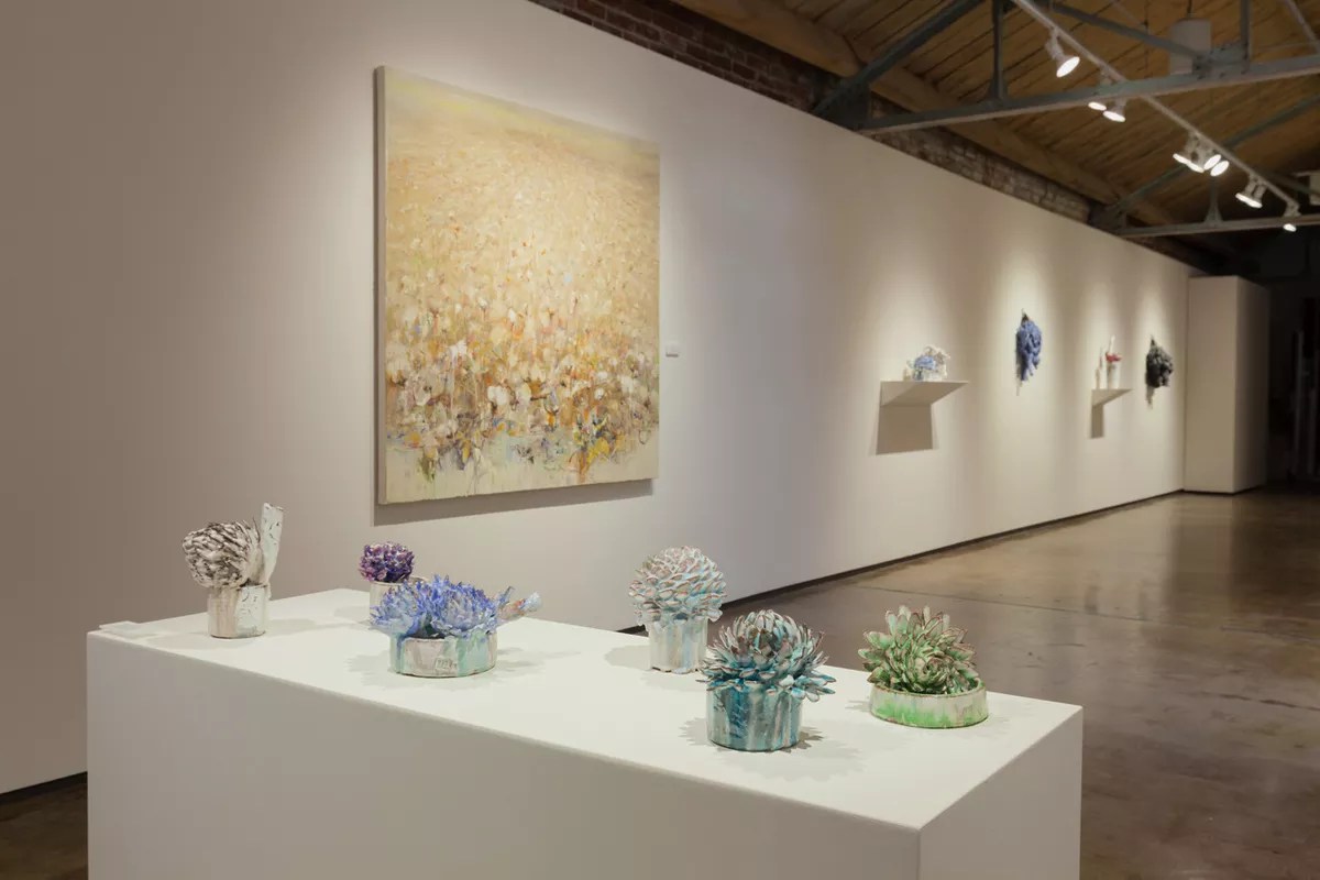 September marks the beginning of the new art season, with the long-running shows of summer finally closing and the first of the fall shows opening. Goodwin Fine Art is coming out strong with a pair of heavy-duty solos: Rebecca Cuming: XXI Century Field and David Hicks: Stone Flora & Blue Cuttings. Gallery owner Tina Goodwin’s pairing of the Cuming paintings and the Hicks ceramics is inspired. Though the works are very different visually, they share a conceptual underpinning: What start as depictions of plants wind up as abstracts.