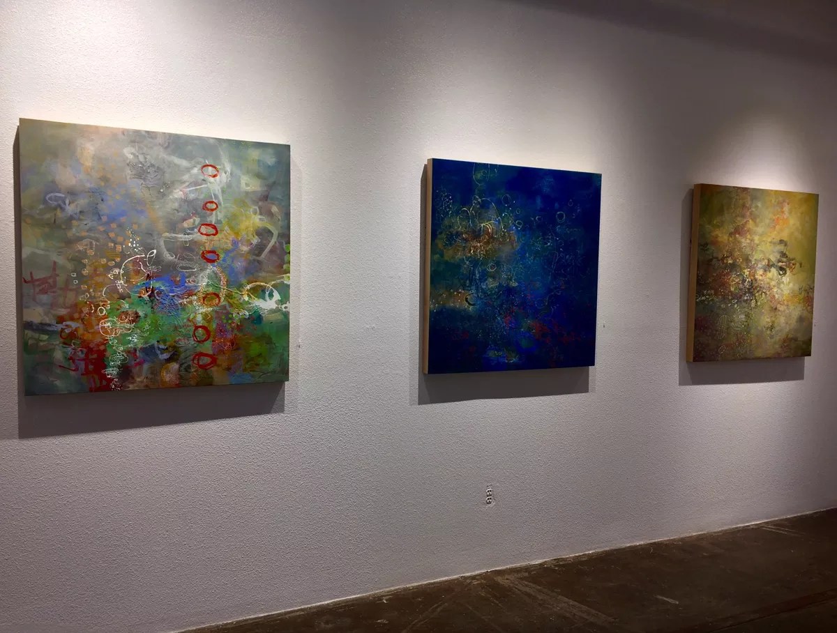 From left: “Juggling With the Natural Order,” “Shade” and “Survival Instinct,” by Deidre Adams, acrylic and mixed media on panel.