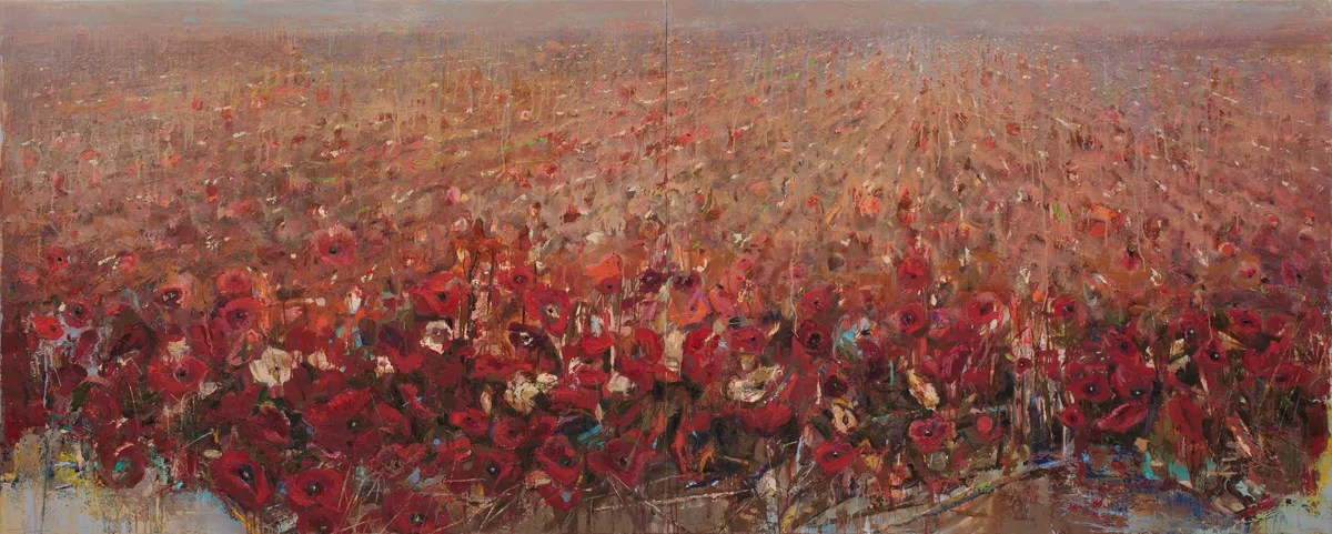 The magisterial and sometimes monumental Cuming paintings, which are in the front, operate on two distinct levels. They’re lyrical floral abstractions, but they also make political statements. A good example of this is “Kandahar,”a huge horizontal panel depicting a field of red flowers that’s organized according to one-point perspective, with the guiding lines visible in the composition. In the extreme foreground are rough approximations of the blossoms, which recede into tiny splashes as they march toward the horizon line at the top. Cuming’s methods here border on action painting, with the pigments appearing to have been applied quickly, with splashes and smears. The resulting surface is highly three-dimensional, covered with lumps and hollows of paint. The political content of the piece is more subtle. The flowers Cuming has rendered are poppies, and Kandahar is a province in Afghanistan; thus, the real subject of the work is the opium trade. Even more explicit is “Dixie,” its sunny palette of buff, sienna and cream contrasting with slave shackles that are nearly hidden by the cotton plants in the foreground.