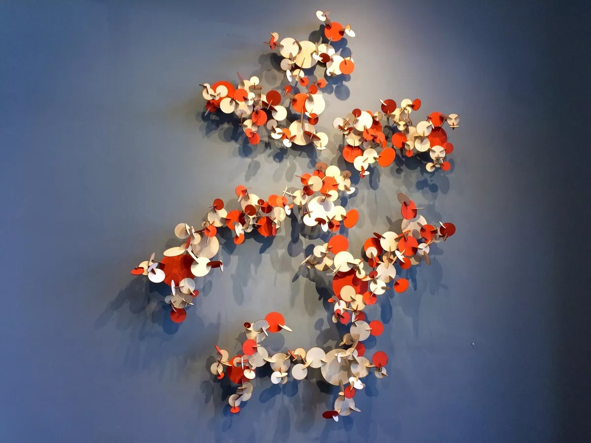 The show begins in the double-height window space with a handful of works by Melissa Borrell, including the enormous installation “The Fractal Nature of Things.” Meandering over the two-story north wall, the piece is built of painted wooden circles that have been slotted together like a balsa-wood model airplane. The colors of the circles alternate between tangerine and white; although every part is geometric, and the title even mentions fractals, the whole takes on an organic shape evocative of a coral outcropping. “Cluster Dynamics,” on the opposite wall, is similar if more complex.
