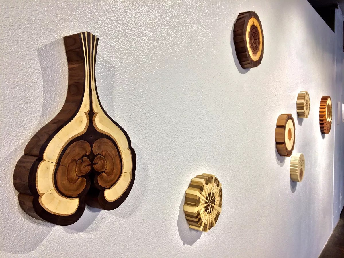 Wood assemblages by Chris DeKnikker, which are all tondo-like wall hangings, represent a cross between abstraction and representation. DeKnikker gathers up found wood and even bark, then cuts it into shapes that he joins together. The pieces here include his signature geometric patterns, but also reveal a new interest in conveying recognizable images. Rather than assemblages of repeated shapes, the newer pieces are more like inlays, with the subjects conveyed through specially cut wooden shapes that suggest a tree or the internal organs of the body, among other imagery.