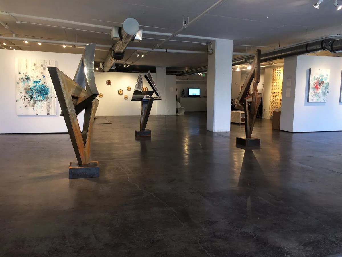 A few blocks away, Walker Fine Art is also starting strong, with Experimental Surroundings, a group effort to which gallery owner Bobbi Walker has devoted the entire space. The show includes pieces by a half-dozen artists – painters, sculptures and installation artists – who’ve all created distinctive pieces that somehow go together. One reason for this success is that the organizing theme is fairly broad, essentially just abstraction with some source in nature; another is that each of the artists is shown in depth, in a dedicated space, allowing viewers to move from one artist’s section to the next.