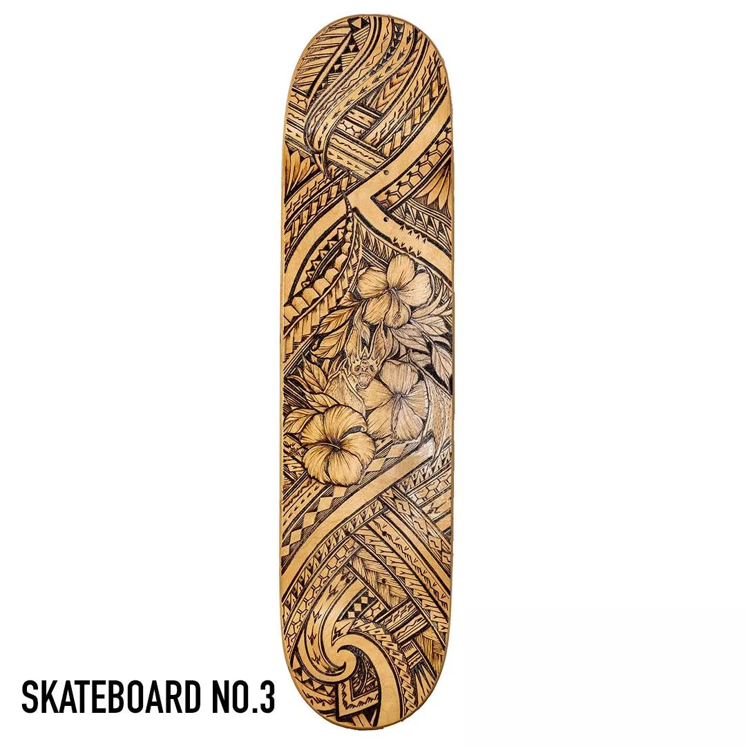 A skatedeck shows off Andy Lio’s wood-burning skills.