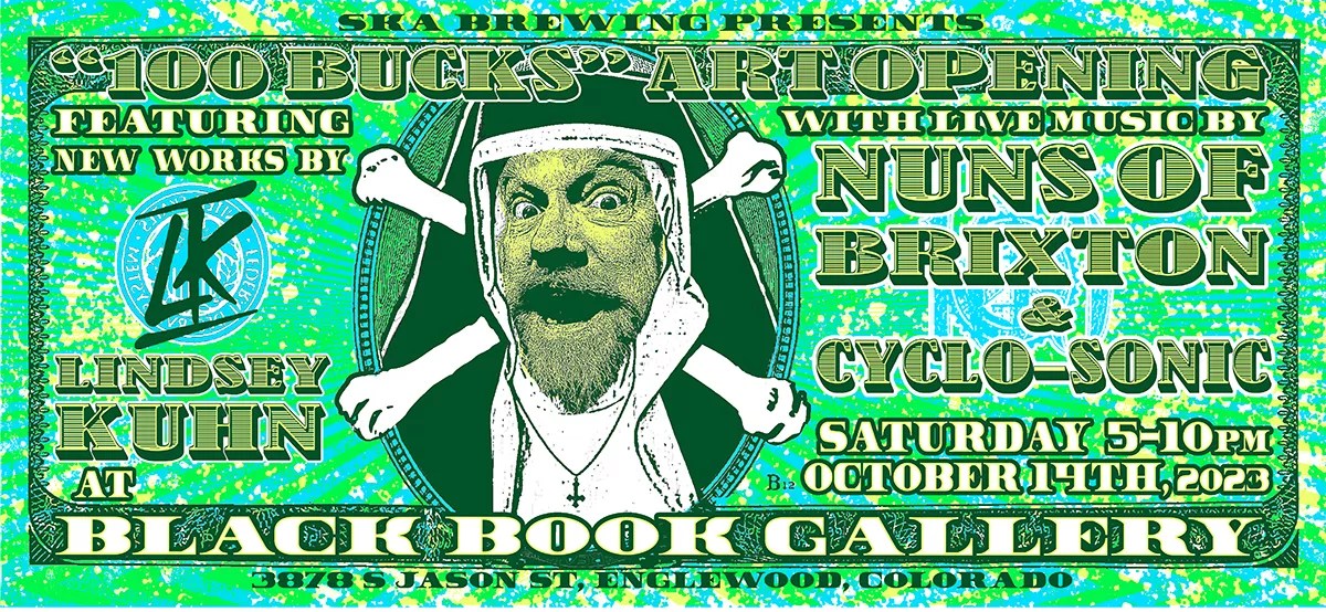Renowned rock and skate poster artist Lindsey Kuhn is the artist feature and party boy of the night on Saturday evening at Black Book Gallery, where a show of Kuhn’s screen-printed, reimagined $100 bill collection emblazoned with portraits of popular figures, from Salvador Dalí and Jean-Michel Basquiat to Joey Ramone and Johnny Cash. The free reception includes live music with the Nuns of Brixton and Cyclo-Sonic, and Kuhn will hold court throughout.