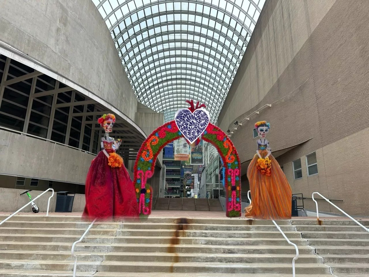 A welcome from Ricardo Soltero’s Catrina Gigantes under the Denver Performing Arts Complex Galleria.