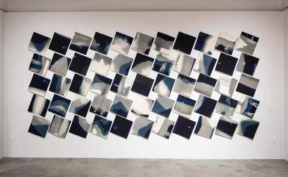 Rowland Rickets, “Drawings,” 2016-2019, indigo-dyed wool felt. Installation at the Museum of Craft and Design.
