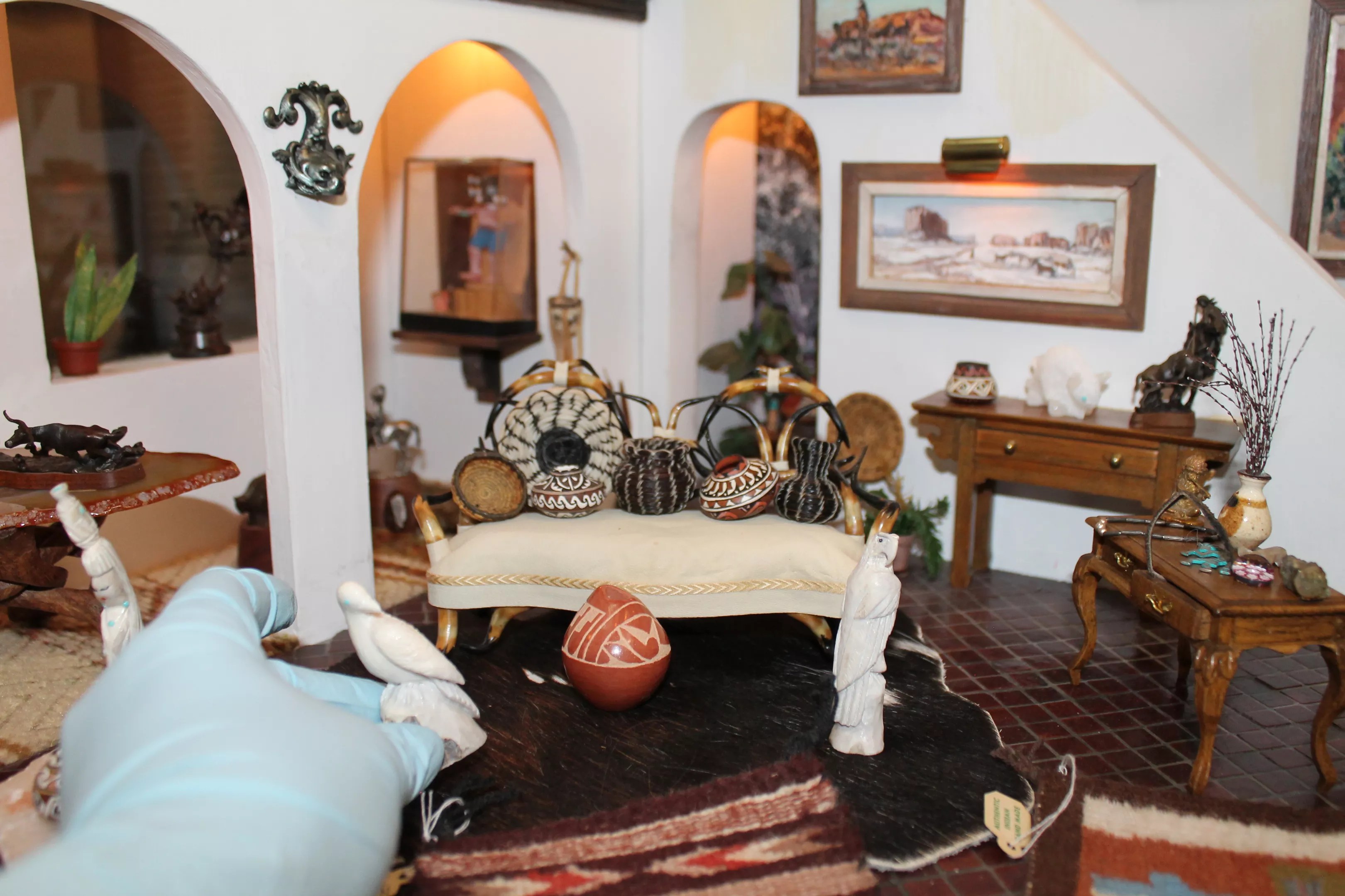 Tiny pieces of pottery, baskets and paintings lend interest to a Southwest-style dollhouse.