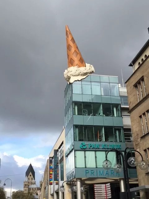 Take their “Dropped Cone” in Cologne, Germany. When my wife and I turned the corner and saw this upside-down cone, we thought we might have inhaled too deeply when we visited Amsterdam. Nope, it is not a hallucination. A masterpiece right there on the building.