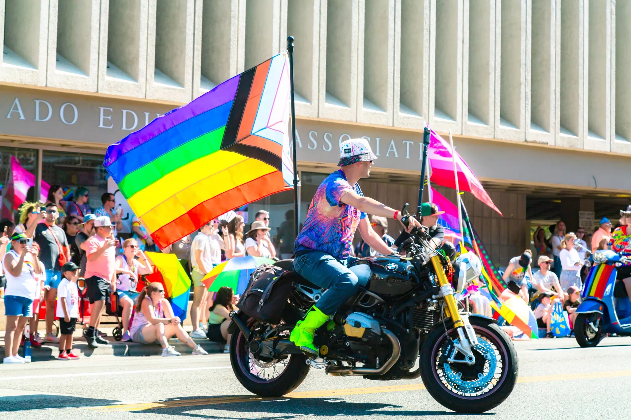 A motorcyclist carries a Pride flag.