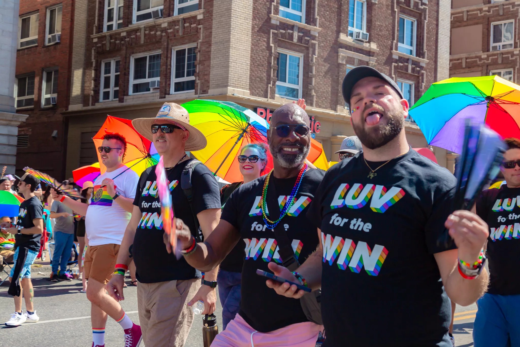 A group of people wearing Luv for the Win shirts at the parade during Denver PrideFest.