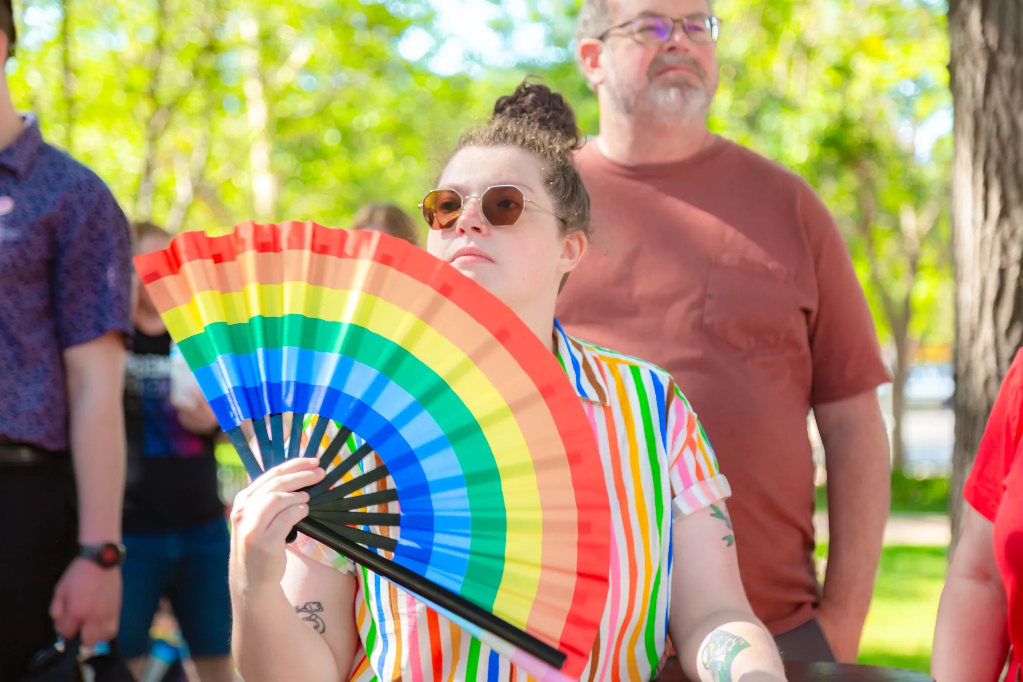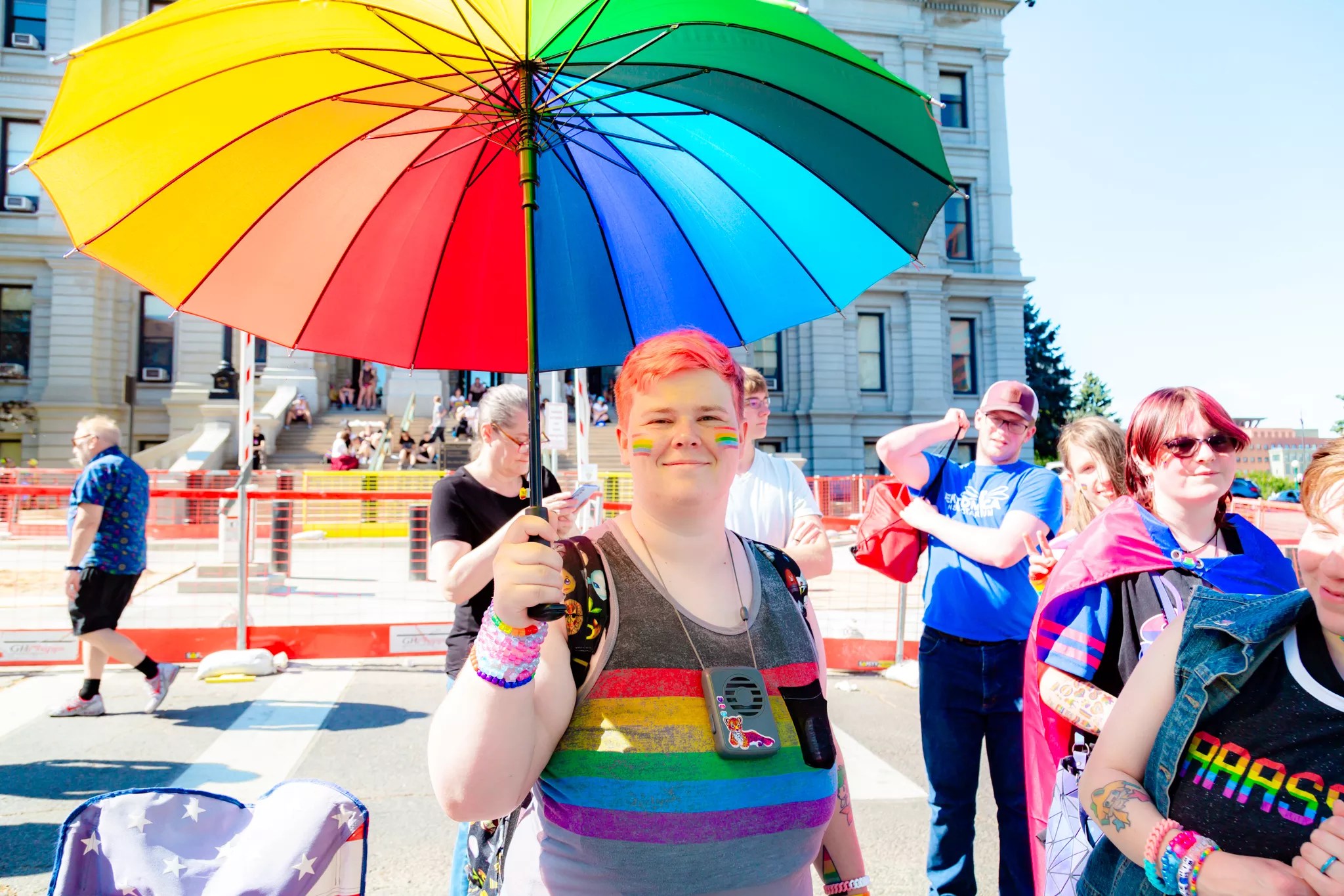 A PrideFest attendee using a Pride umbrella to stay cool.