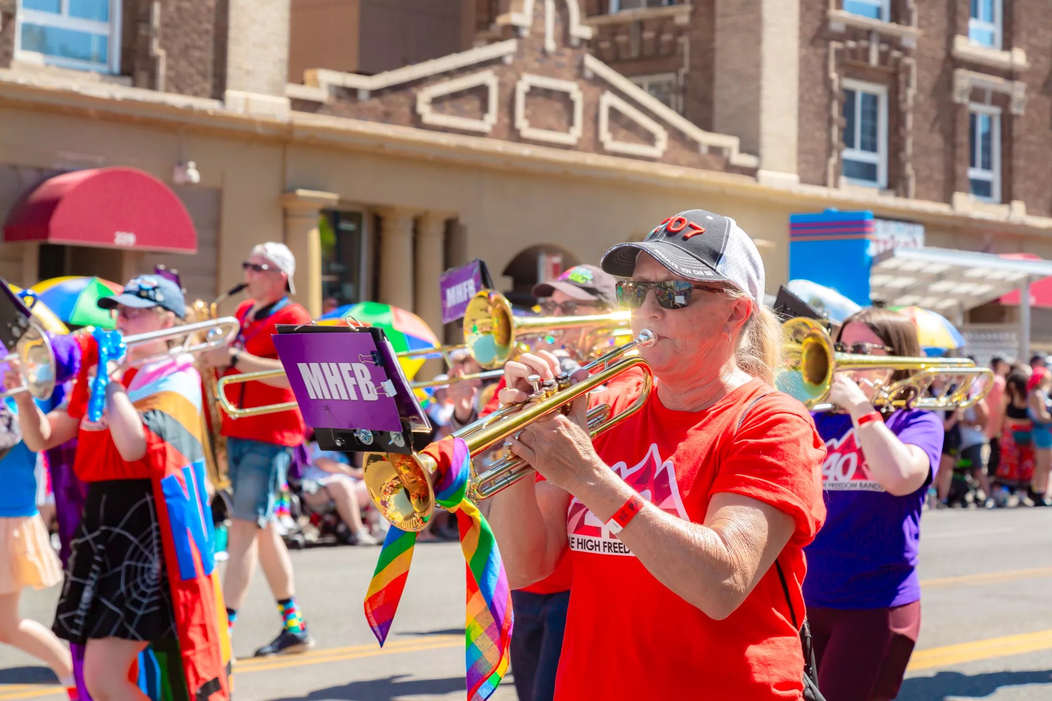 A man playing the trumpet during the Denver PrideFest parade.