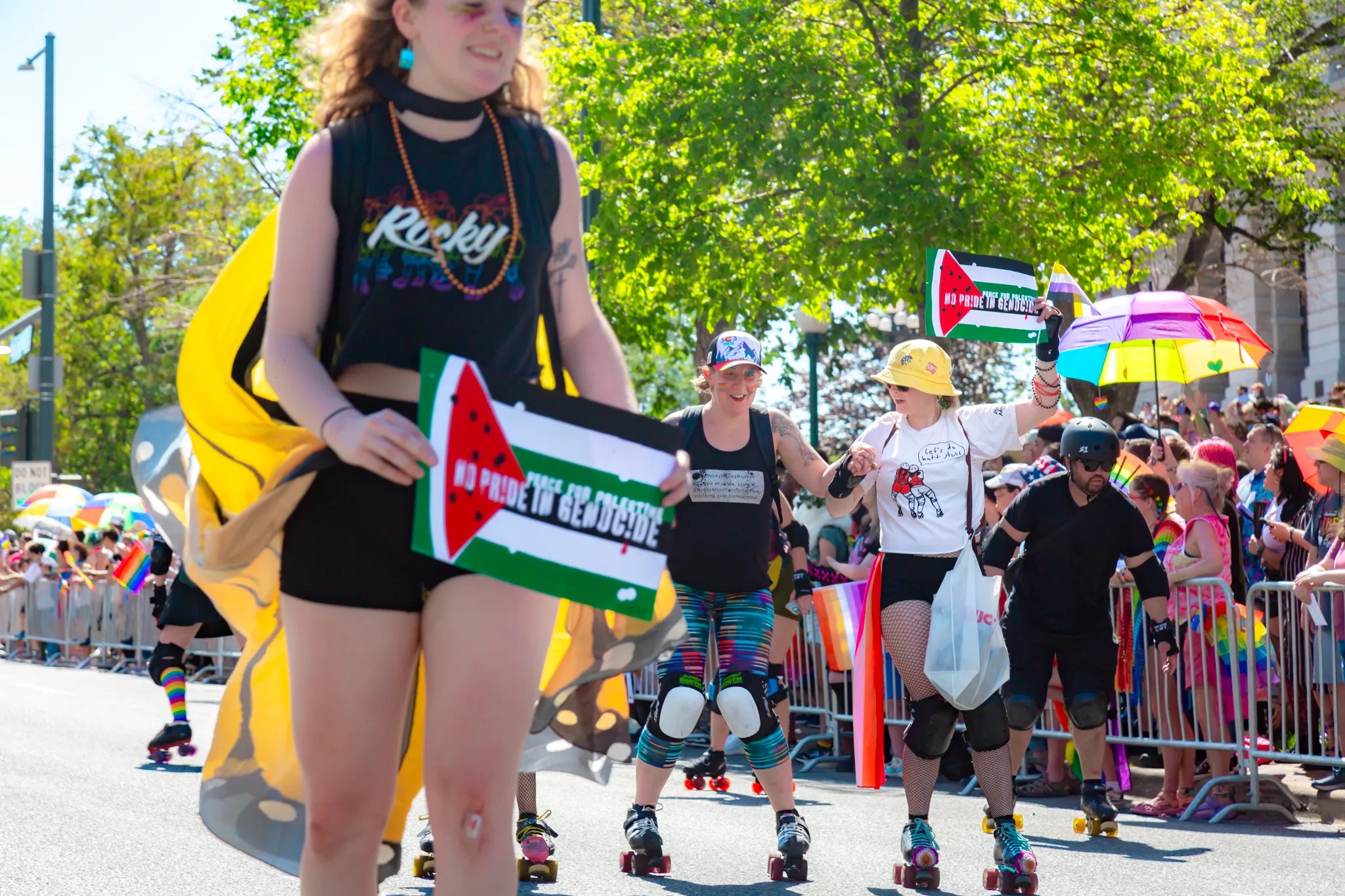 About 200 pro-Palestine protesters delayed the parade at its start on Sunday, before police moved them to the side of the street, according to CPR. The demonstrators later joined the parade down Colfax, and were welcomed to the PrideFest stage by MC DeMarcio Slaughter, who asked them to share their perspective. As many have since noted on social media, the history of Pride events is rooted in the right to protest, as well as the intersectionality of major issues.