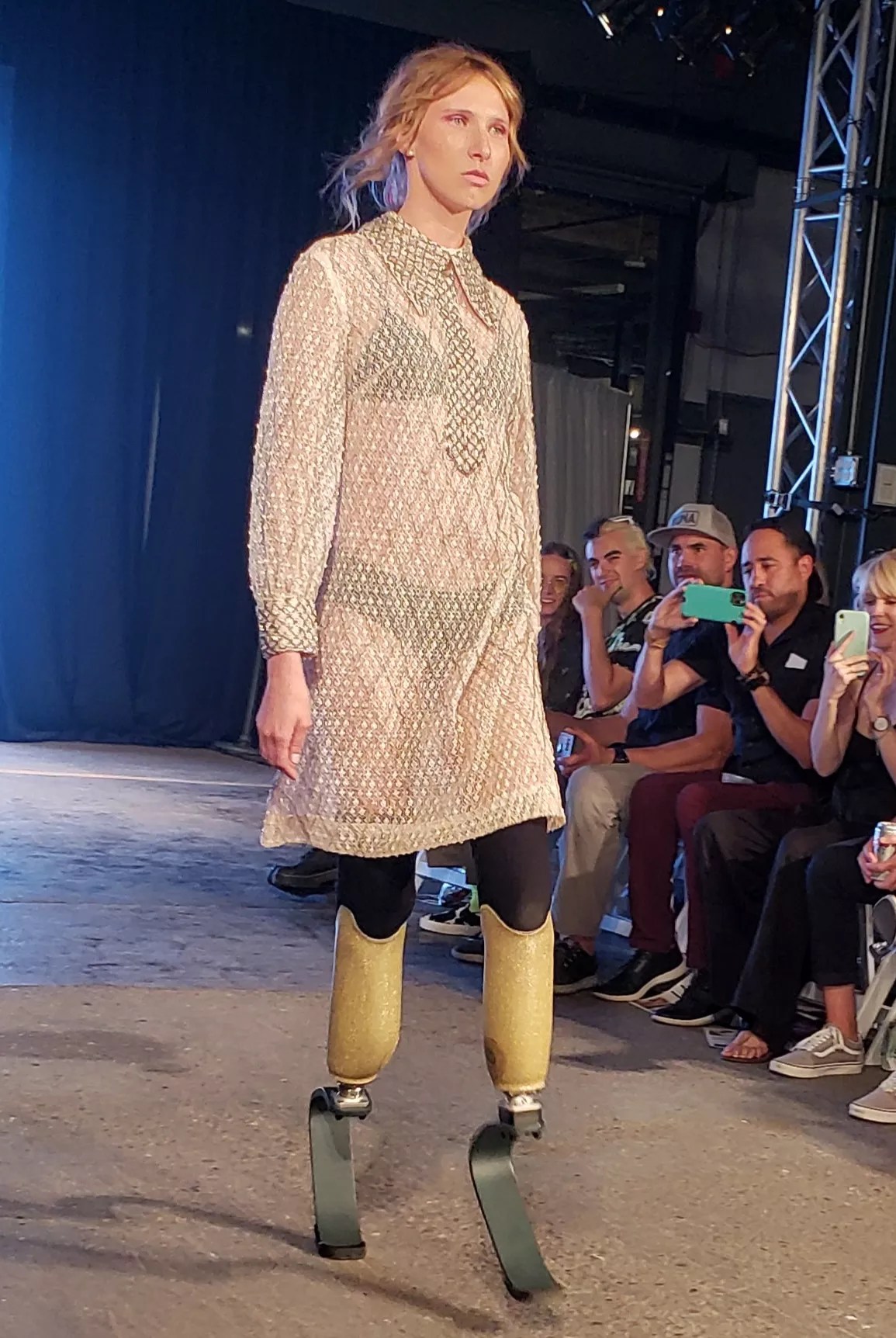 She made the tough decision to remove her right leg in January 2021. Six months later, she made her modeling debut at Denver Fashion Week as a double amputee using running-blade prosthetic lower limbs. “It felt so good to walk again,” she exclaims, adding that she didn’t expect to be cast for any of the shows. She ended up being asked to walk for designers on all three nights. “I started hearing from designers that they wanted me to walk for them, but someone else had beat them to it.”