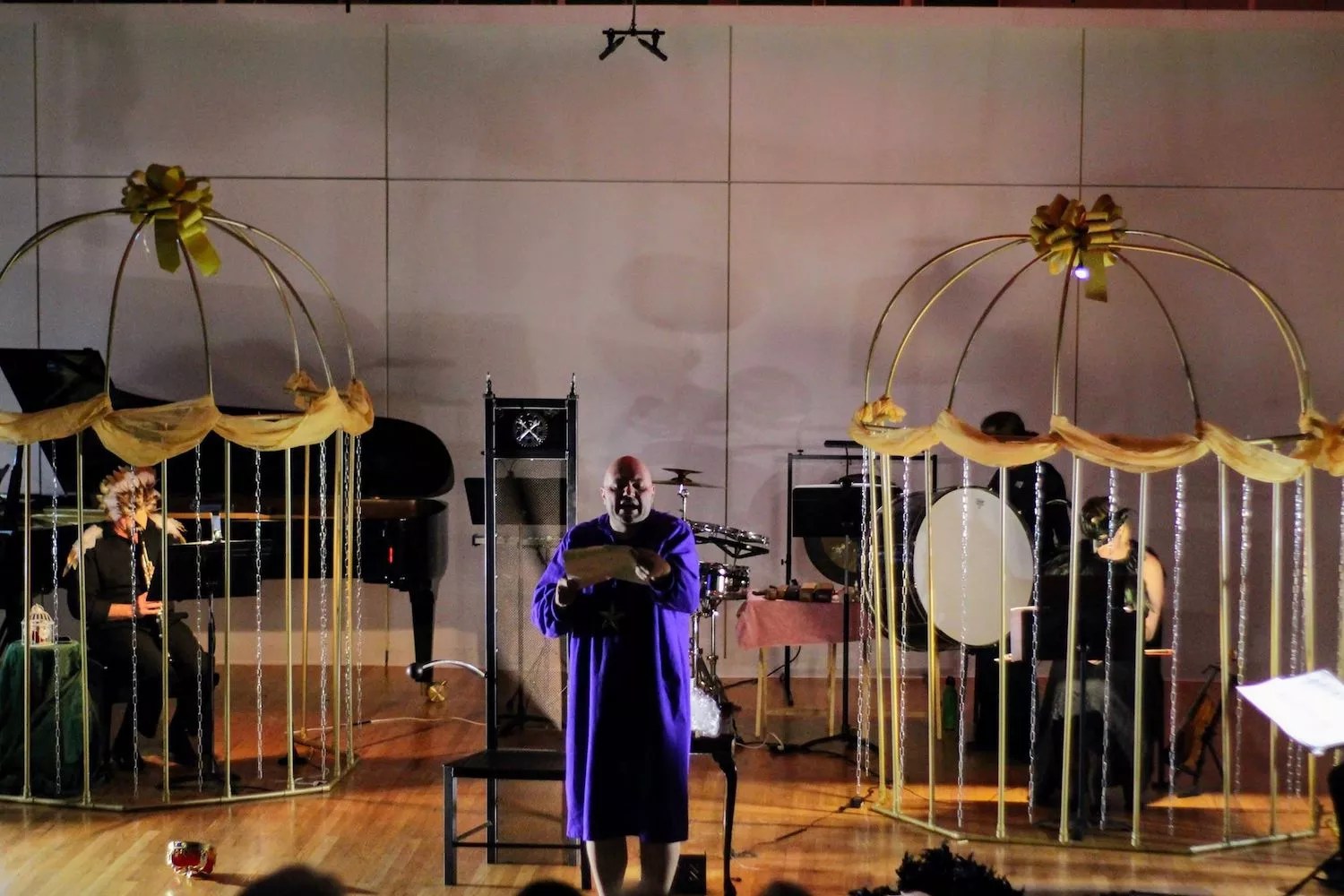 Based on the story of King George III, who in the throes of insanity was locked in a room with his pet bullfinches and a mechanical organ that played eight songs, the work is as mad as the king himself: As the tale goes, he was obsessed with teaching the birds to sing the songs. Performed in costume with a set of giant birdcages representing each song, Eight Songs is, according to Kehn, “something audiences have never heard or seen before, performed on a crazy stage with birdcages. It’s a fascinating spectacle.”