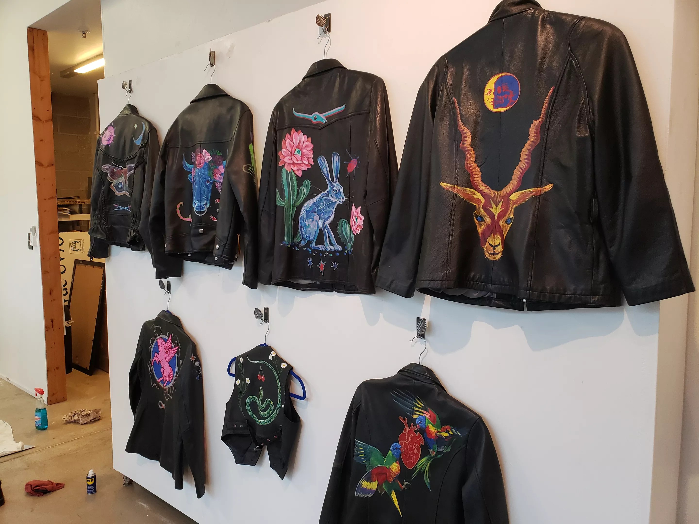 She’s also directing a fashion show at the opening that will highlight seven leather jackets she hand-painted to explore identity. The idea came to her when she was creating Halloween costumes last year for herself and her boyfriend.