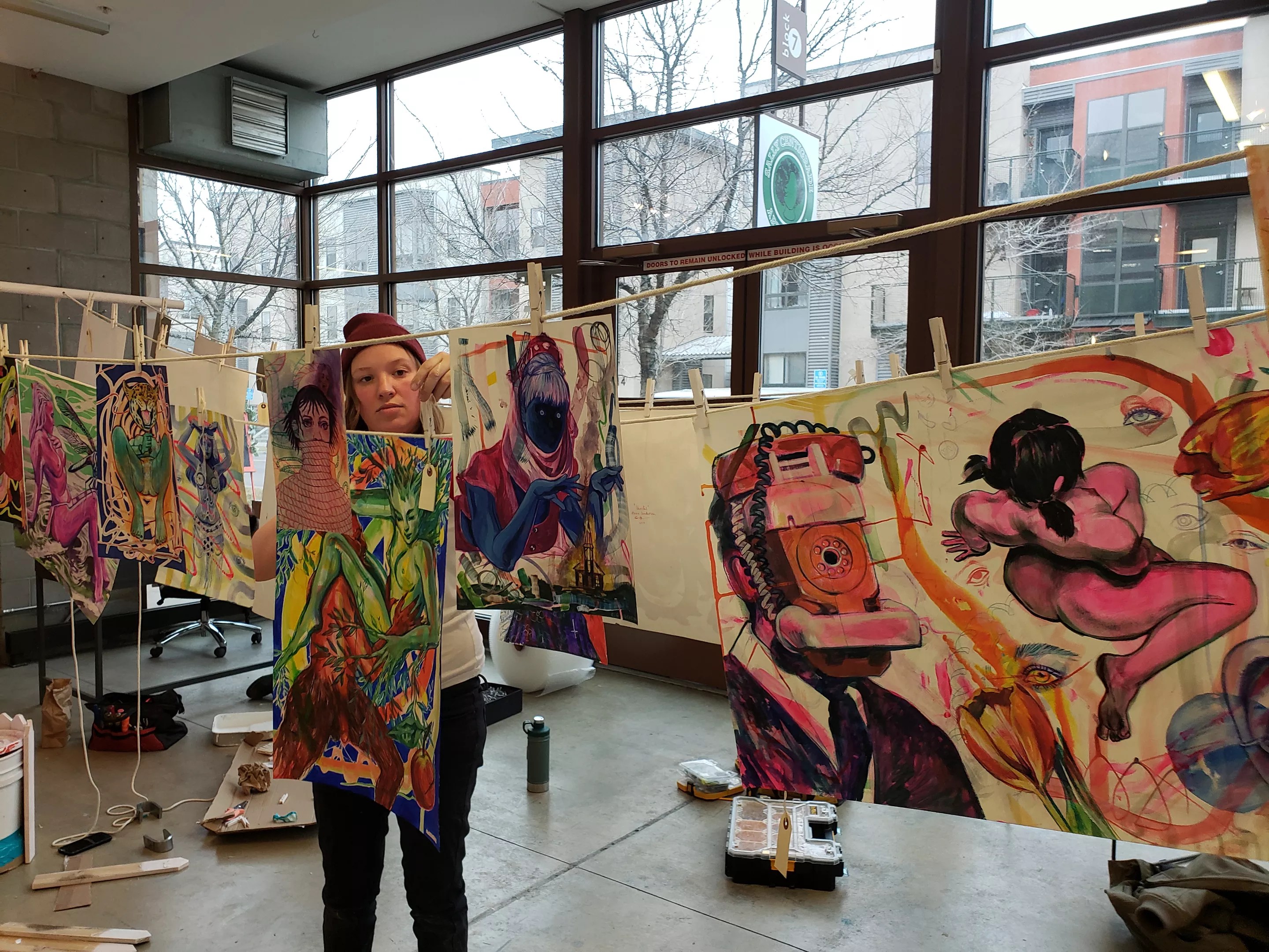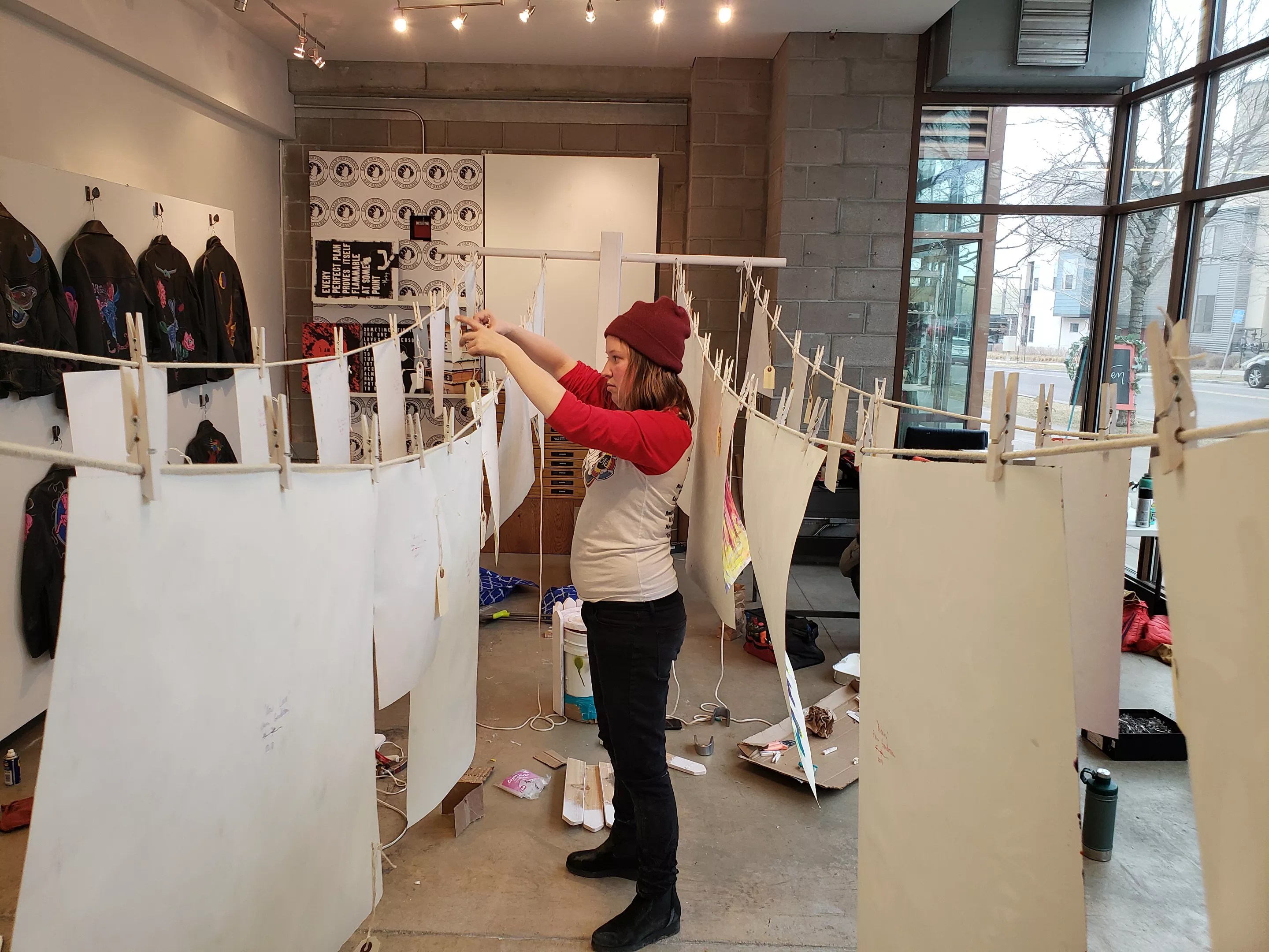 Elena Gunderson hangs new work on a custom-built laundry line for Dirty Laundry, opening March 7 at Sally Centigrade.