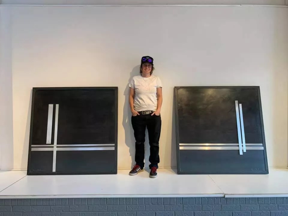 Virginia T. Coleman poses with her steel sculptures at Next Gallery.