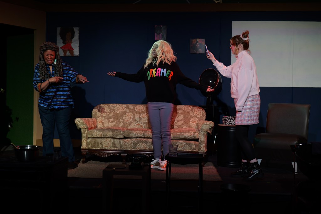 “It’s a very intimate venue, and I love intimate venues for theater,” Mahogany says. While her original vision imagined the play fully in the round, the final staging uses both a raised platform and a floor stage, allowing ensemble members and leads to move back and forth while keeping the audience close to the action.