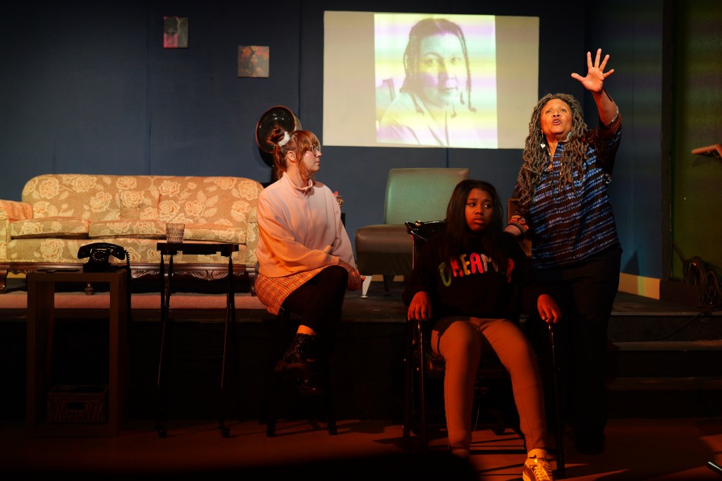 Movement, Mahogany says, is the guiding metaphor of the piece. “I’m thinking of it as a train moving,” she says. “You’re seeing the train moving and these stories just passing by.” That sense of flow is carried through choreography by Elizabeth Joy, who shapes parody “commercials” inspired by nostalgic Black hair products, a choreographed poem for G-ma and other dance-driven pieces.